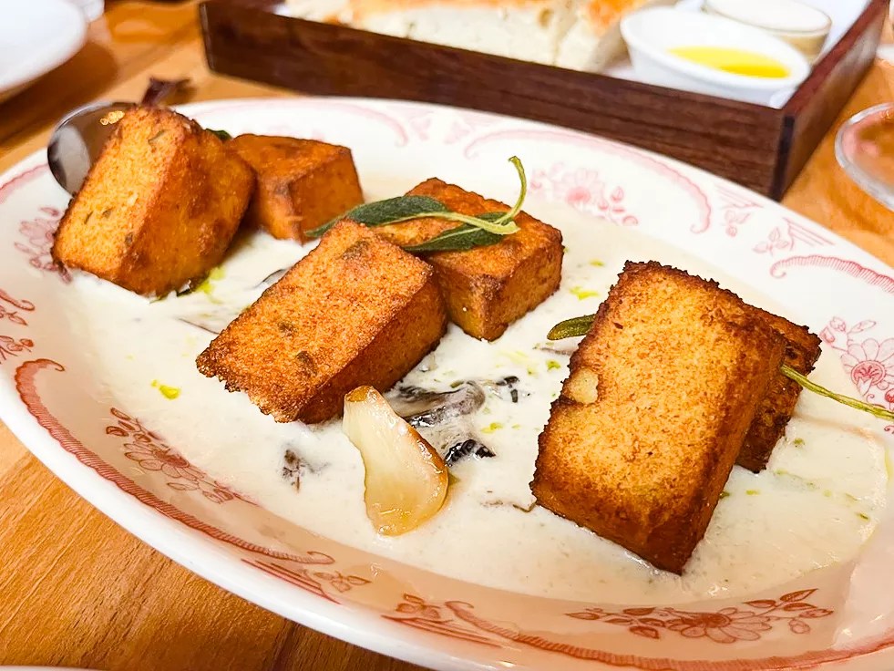 Polenta fries float inside a tangy mushroom-sage-gorgonzola cream.