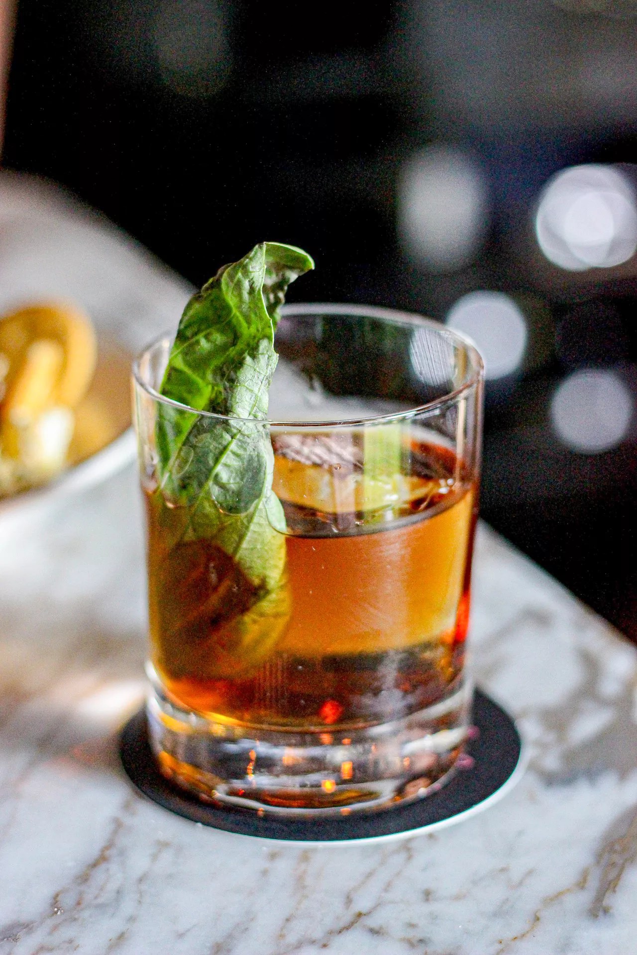 Its rich molasses and caramel flavor make this an utterly decadent cocktail. Then comes the artichoke amaro for depth, ginger liqueur for a bit of bite and a giant basil leaf for a nice nose. (Really, though … I’ve never seen basil this big.)