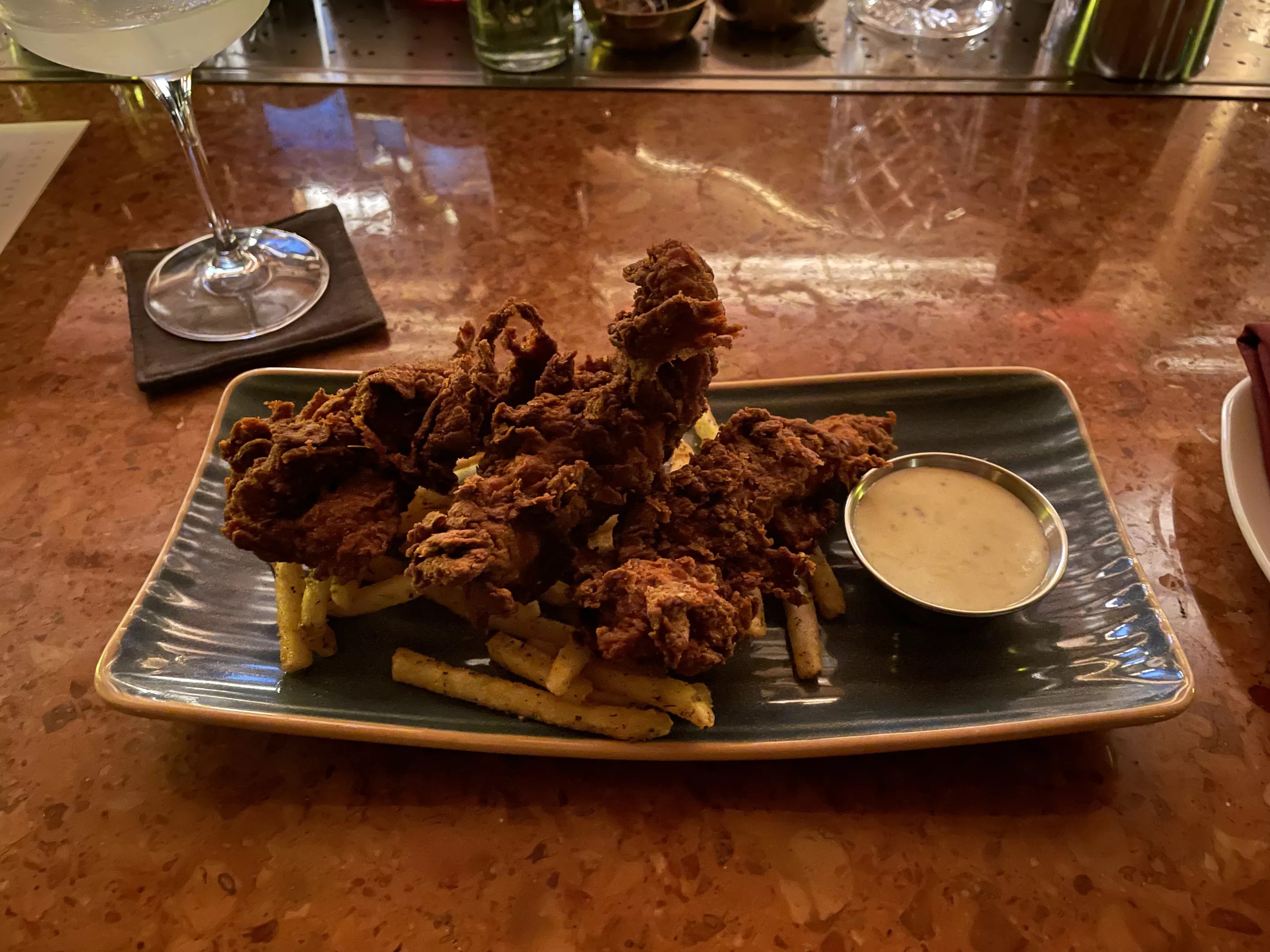 We couldn’t pass up another opportunity to order a kids’ menu item at a bar and retain our class and elegance. So compared to the $24 offering at Babou’s, CC Club’s $17 tenders and house fries seemed, dare we say, reasonable. We finally caved. We were curious. Aren’t you?