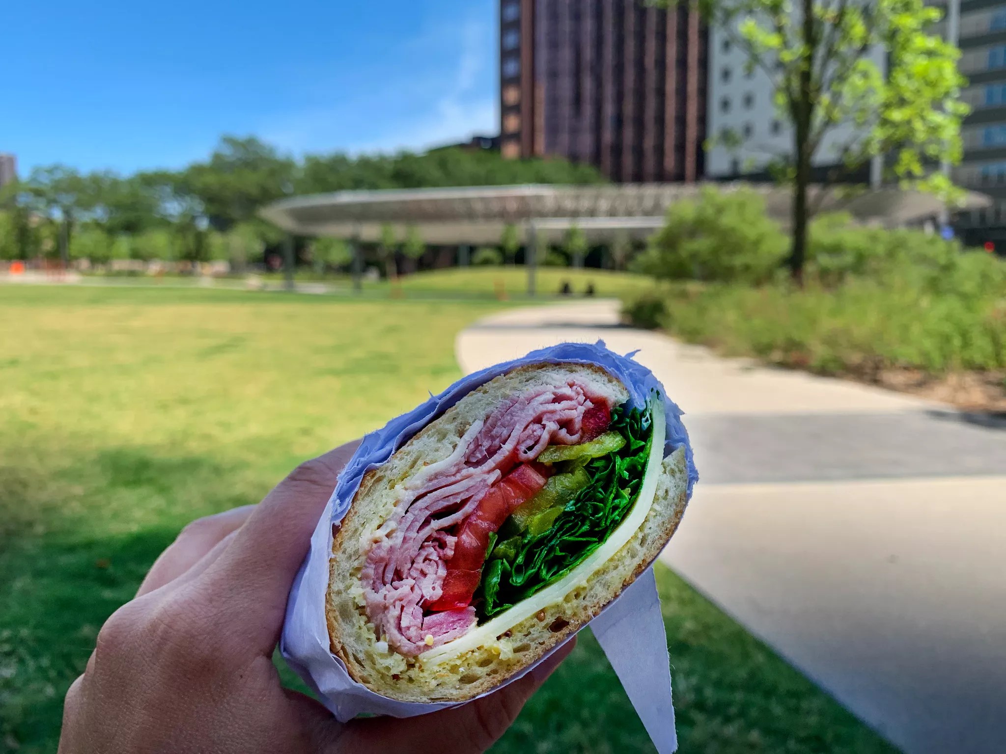 There’s also something nice about sitting on the grass of Dallas’ newest park and unfolding butcher paper to reveal an intentionally stacked sandwich, which you will get every time from Commissary.