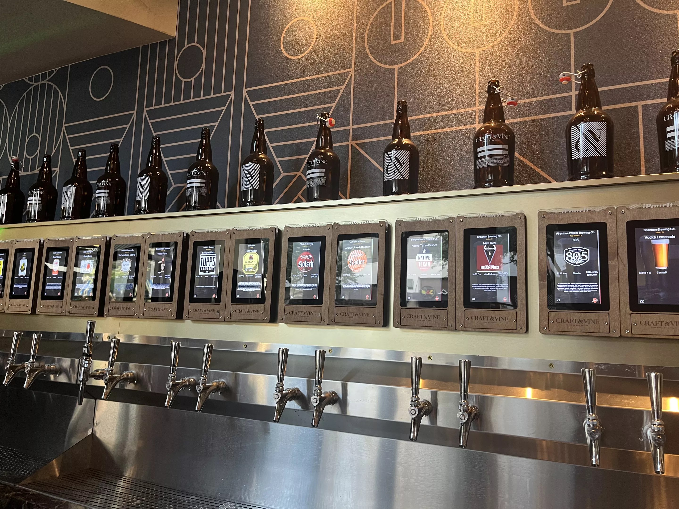 Craft and Vine also offers a self-serve approach. The taproom to the left of the dining area offers 40 or so smart-screens, built into the wall, labeled and filled with different drinks. Drinks are priced by the ounce, and your currency is an electronic wristband that you link to your credit card at the front register. Convenience can be dangerous and costly.