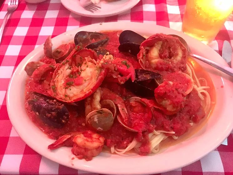 Lobster fra diavolo, a spicy tomato sauce atop linguine with a boat-load of shellfish.