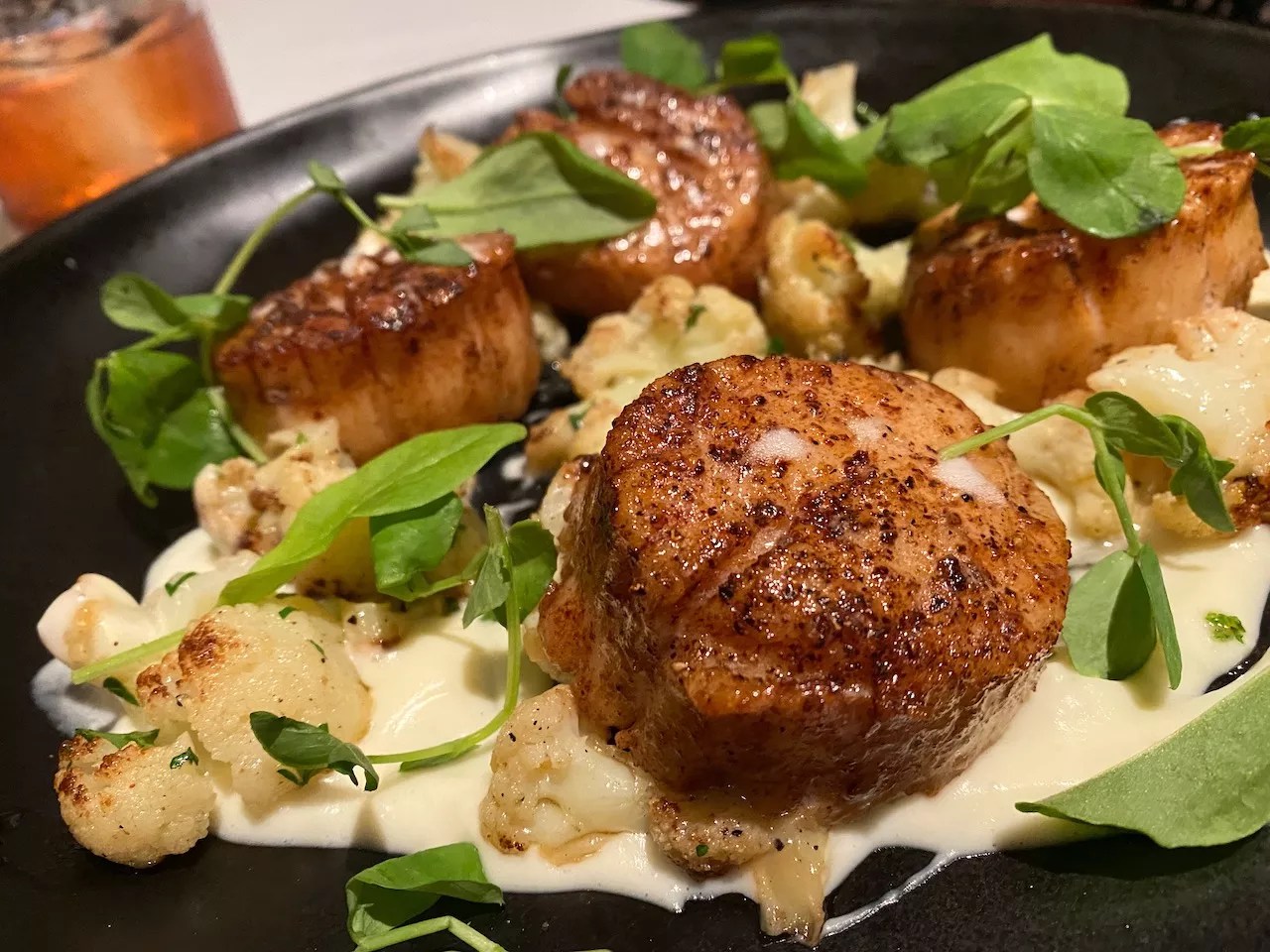 A dish of jumbo sea scallops is served with small stems of lightly roasted cauliflower and sweetened with an Asian pear mostarda. The short rib agnolotti with bordelaise, tart cherries and long thin strips of shaved aged Parmesan feels like an Italian imposter in this dark steakhouse; it’s a delight.