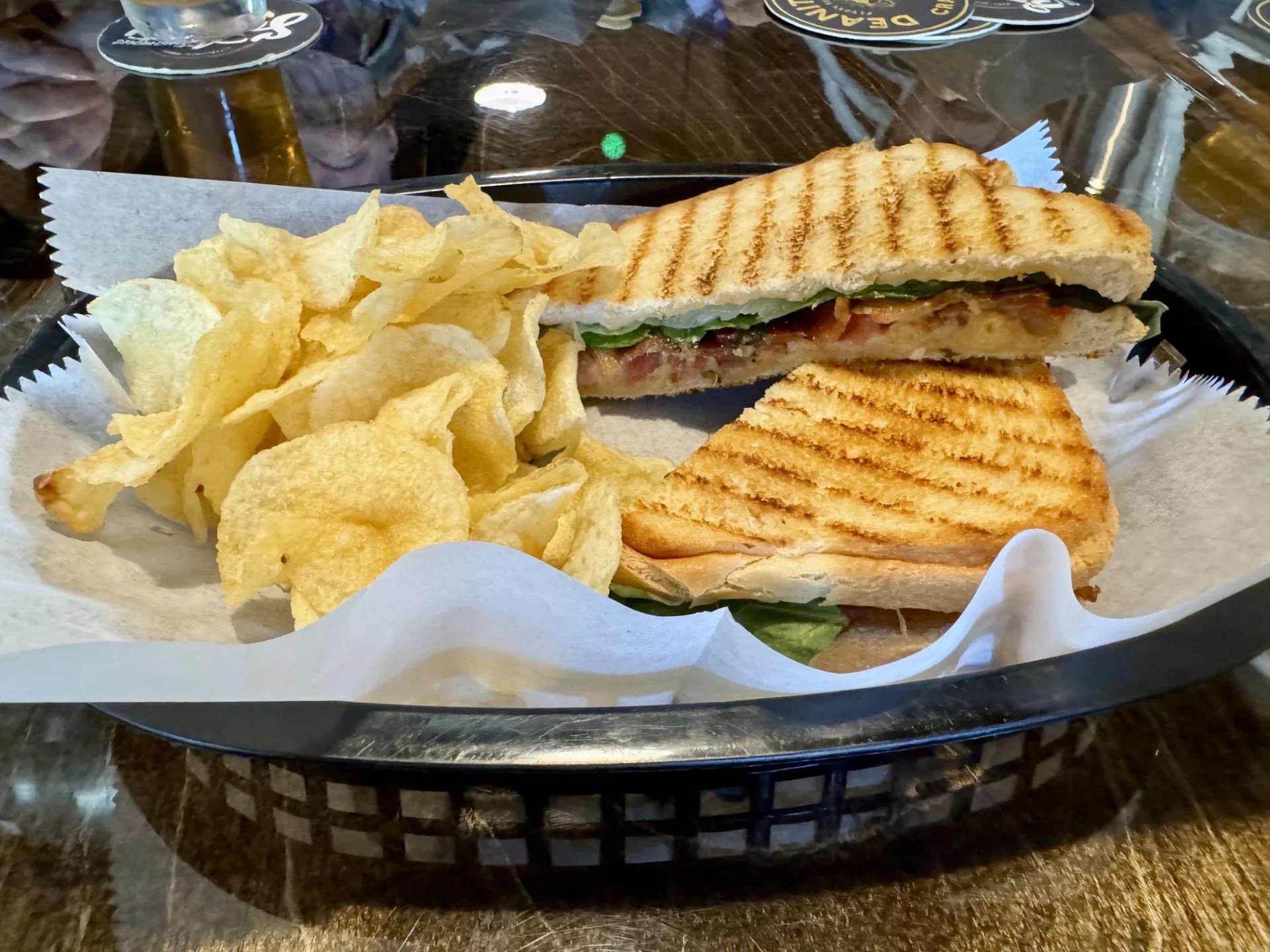 Our table started with a beer-candied BLT ($10.75) with thick-cut bacon, baked and candied in a sweet and peppery Big Rig lager glaze, with romaine, tomato and sriracha mayo. Next, we tried a pair of Bellman’s BBQ tacos ($11.75): pork belly braised in Asian spices and the house English porter, then topped with citrus cabbage slaw and a sweet hoisin-based Bellman’s BBQ sauce. Both were upscale bar bites. But our final order – banh mi sliders ($11.75) of braised pork belly topped with pickled carrots, daikon, cilantro and sriracha mayo – were some of our favorite bar bites of 2024.