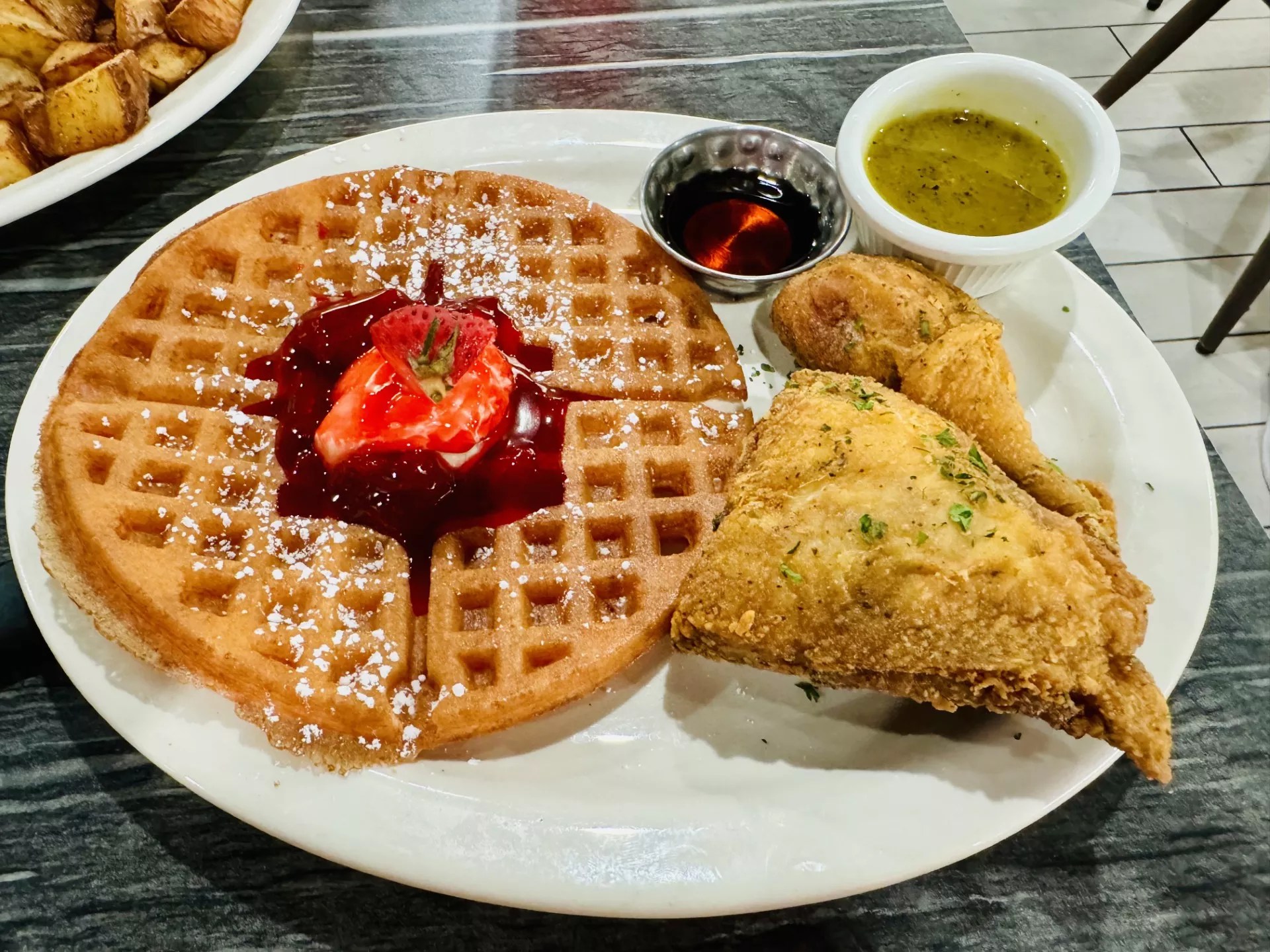 We chose the two-piece fried chicken, a strawberry waffle and a side of lemon pepper sauce. The chicken was on the smaller side but well cooked and seasoned nicely. The waffle was fluffy with a dollop of cream and strawberry sauce on top. Maple syrup comes on the side. This dish was worth the $16.95 price tag.