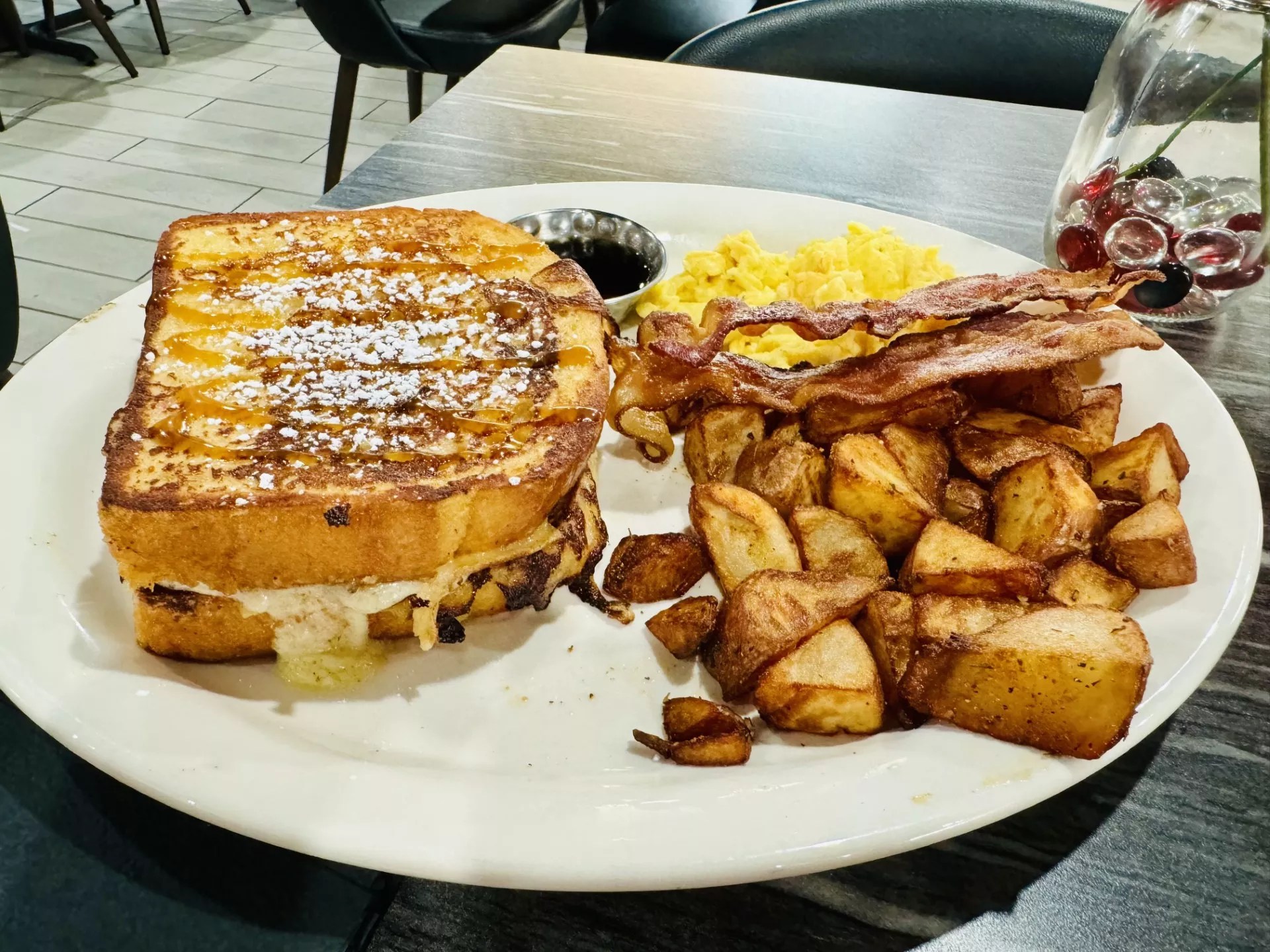 Cream cheese stuffed brioche French toast, eggs, potatoes and bacon.