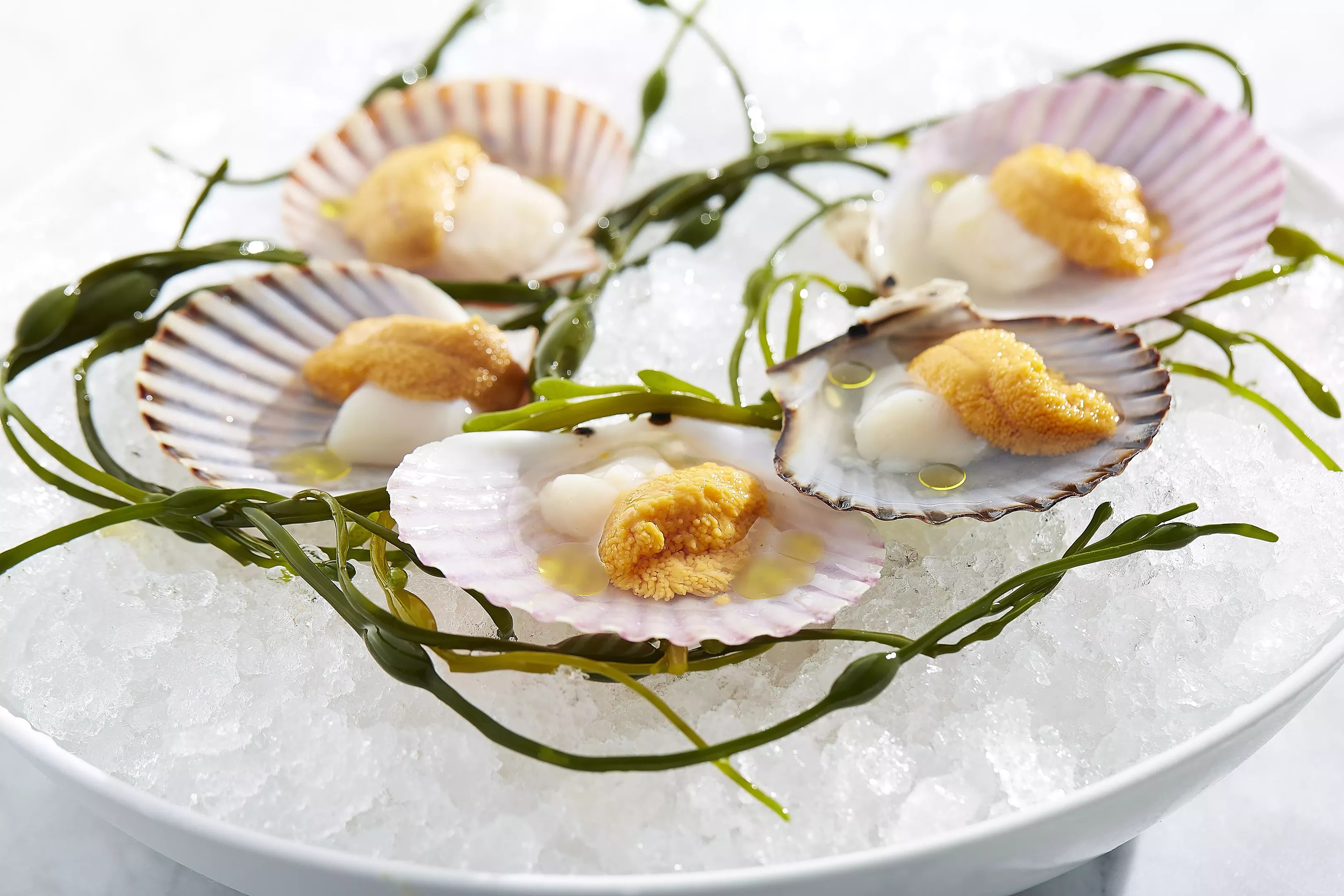 Nantucket scallop with uni, tomato water and mustard oil.