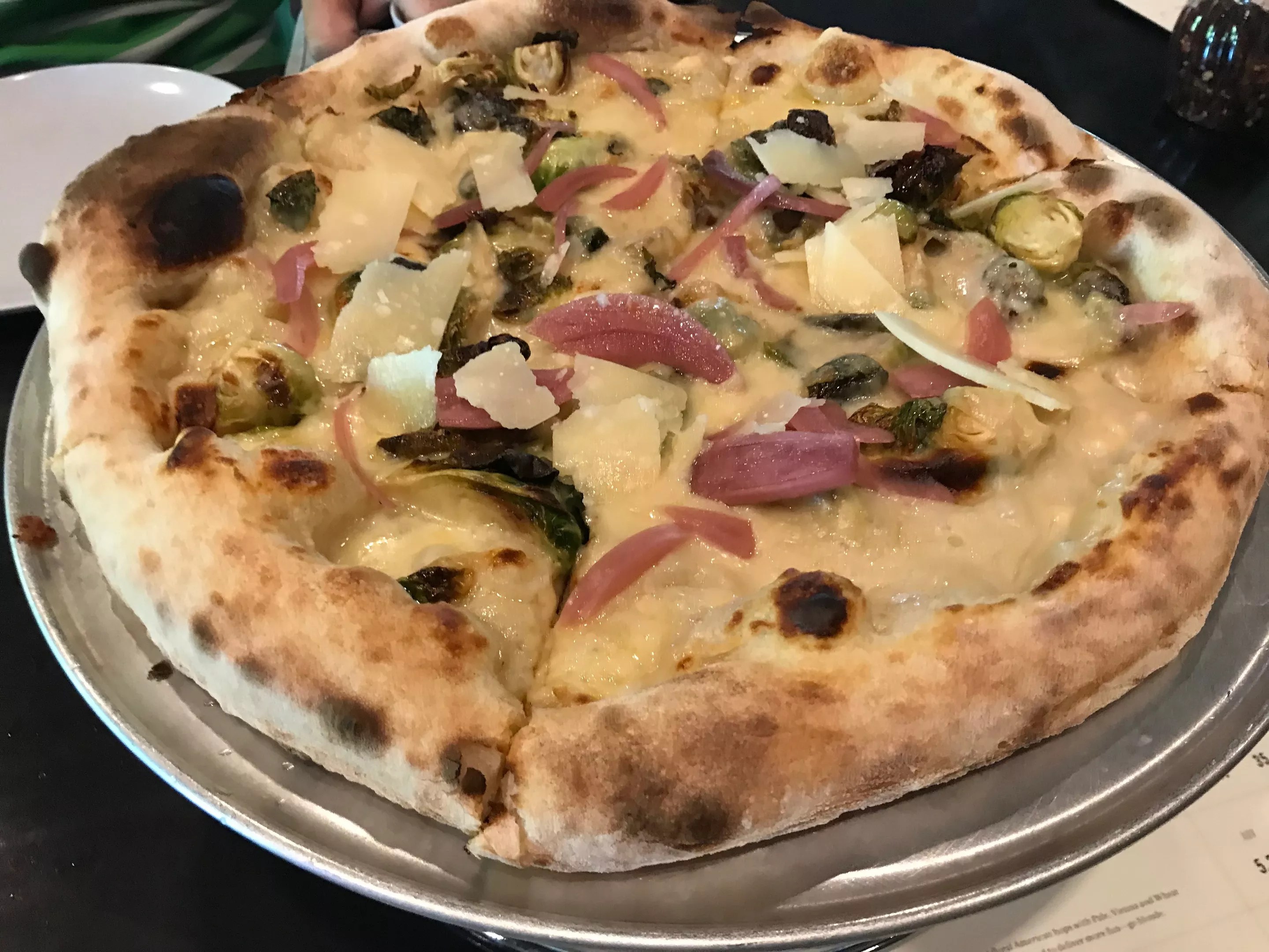 Feeling adventurous, this carnivore allowed himself to be coaxed into trying the Brussels sprout pizza. The white pie, made with thin shavings of smoked gouda and parmesan, pickled red onion and garlic honey drizzle, was indeed a winner.