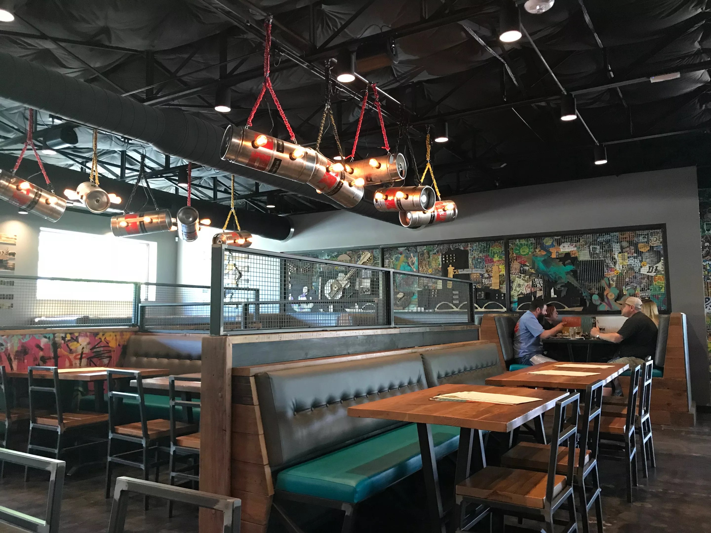 With plenty of natural light filtering in, the industrial space with exposed ceilings and tables and chairs built from wood and metal give it a warm feeling despite being an old warehouse. DEBC’s signature yellow and teal colorway was present all around, mixing in with vibrant graffiti-style mural art and inventive light fixtures fashioned out of empty used gunmetal-gray pony kegs. With an array of booths and tall pub-style tables stretching out from the main rectangle-shaped bar, a Cowtown-dweller that hasn’t traversed to the original DEBC outpost will likely feel they’re in a rather hip gastropub designed just for them.