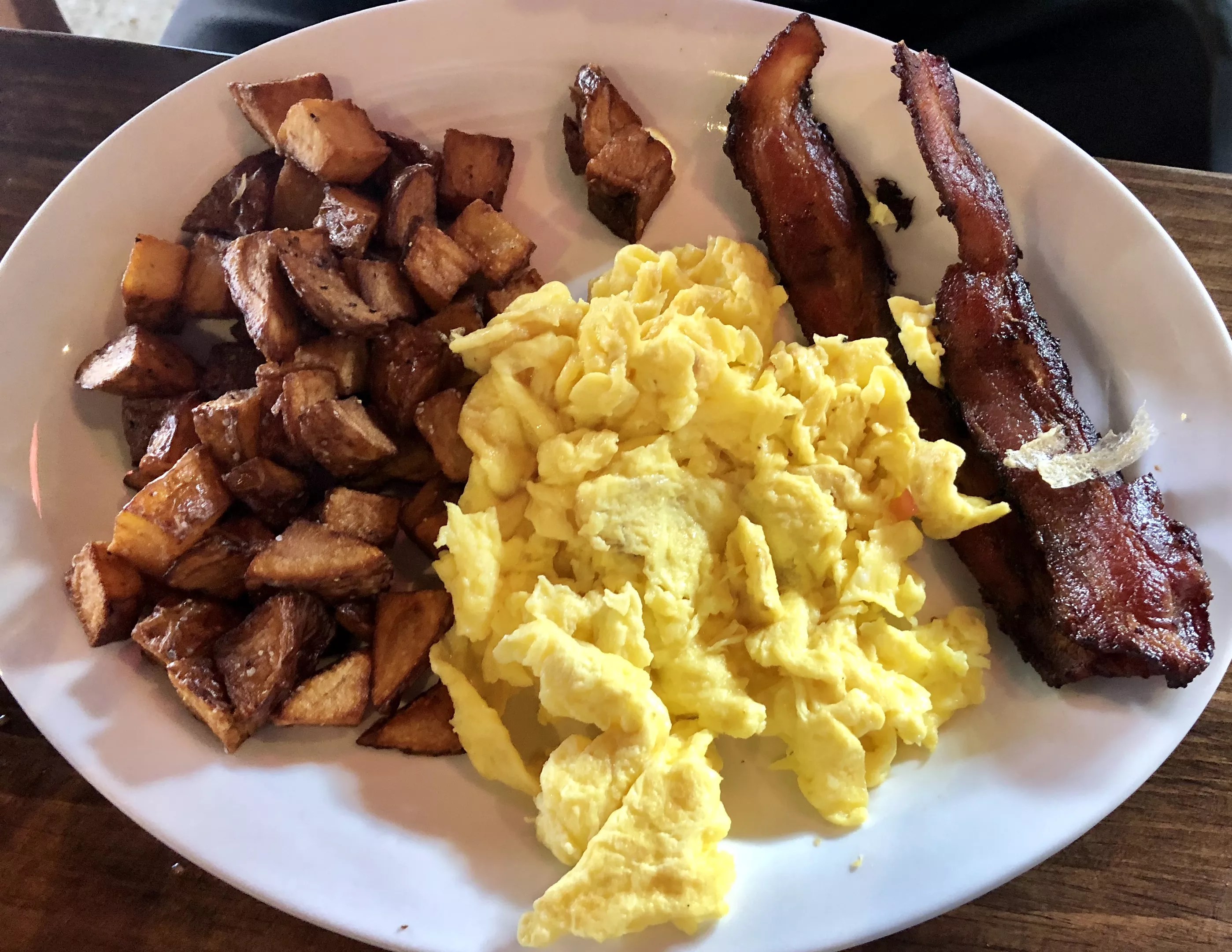 Across the table, the eggs came out how they were ordered (a cause for celebration for those of us who like them over-medium). The gravy has a seasoning and consistency that call for seconds. The bacon is what bacon should be. And go for the Wagyu sausage, which is so good it could be a meal on its own.