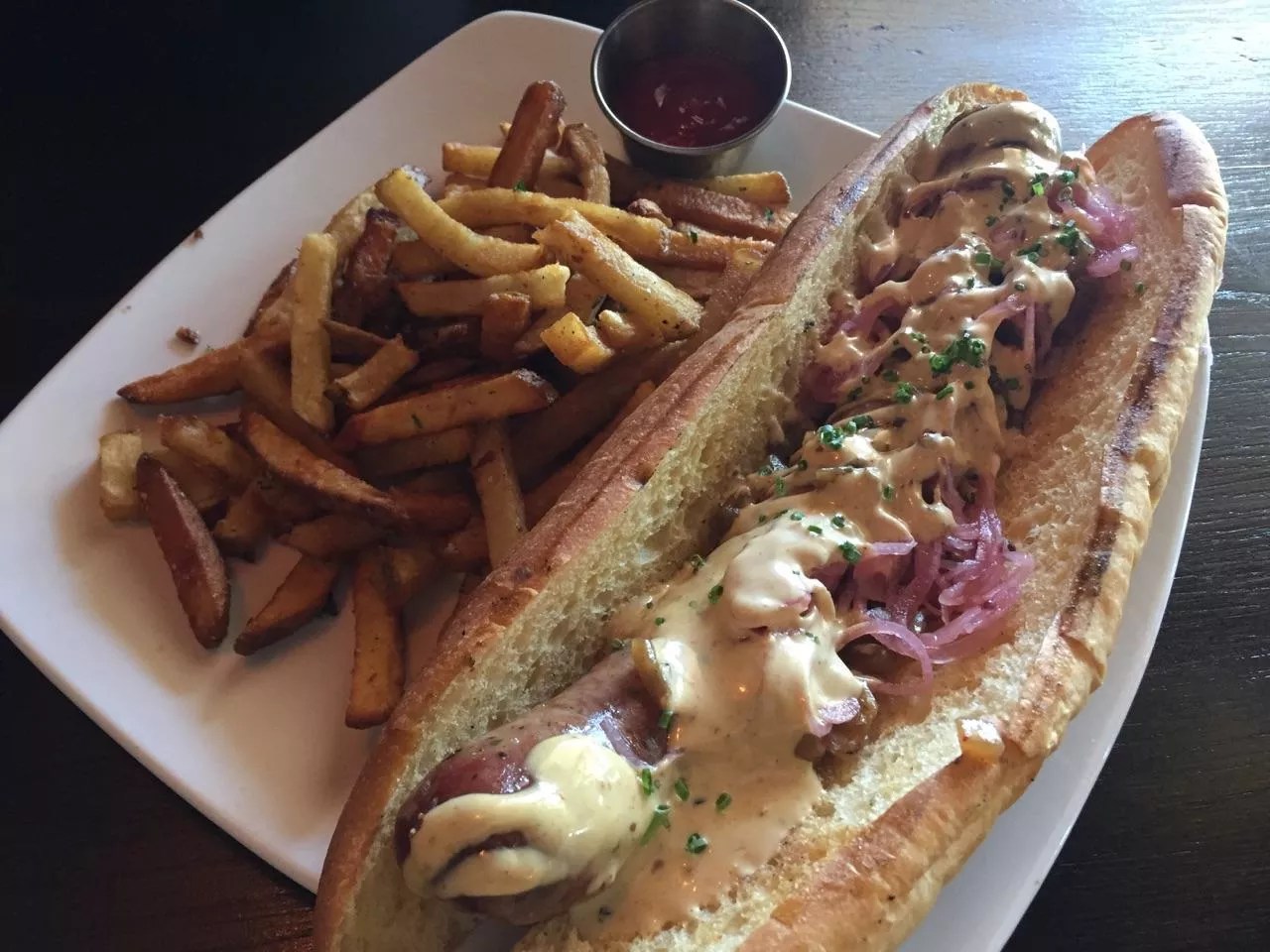 A variation on the Eastern European theme can be found in dishes like drop-dumplings with sausage ($11), the schnitzel sandwich ($11) and the ridiculous sausage sandwich ($15). Why do they call it ridiculous, you ask? Because it is 13 inches of meat-tube. But where others see a metabolic challenge, we see a mere test of will. And so we ate all 13 inches of caraway- and ginger-spiked sausage. It was a glorious thing: a delicately flavored sausage married with a creamy coriander mustard and topped with pickled shallots and caramelized onions, which delivered just-right punches of acid, umami and tang.