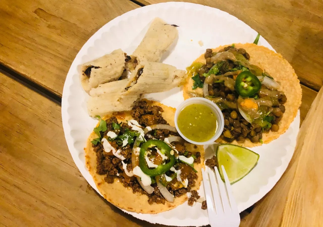 After losing about 100 pounds over the past year or so, Flores started paying really close attention to the ingredients in the food he was serving. He’s since found that he gets a lot of repeat business for that very reason. People will go to the breweries where he’s a regular and get plates of tacos and tamales to go, particularly for the vegetarian options.
