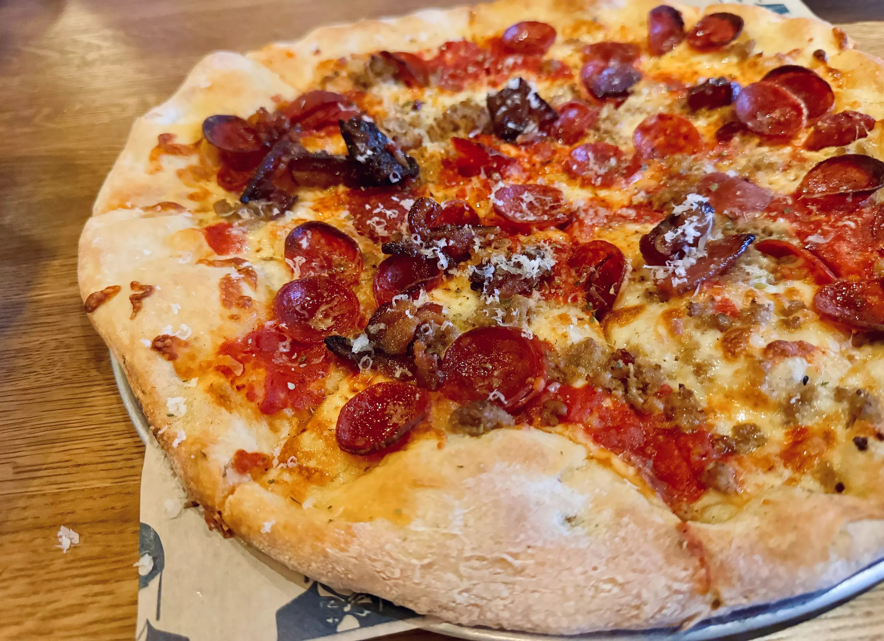 Pizzas here represent the “dough” portion of the marquee out front. A crunchy and chewy crust is bouncy in spots and thin in others with nice toast on the undercarriage. If we had to go back, and we will, we’d get another pizza for certain. The Aviator ($21) comes with pepperoni, Italian sausage, Nueske’s bacon, crushed tomato sauce and mozzarella. We took part of the pizza home.