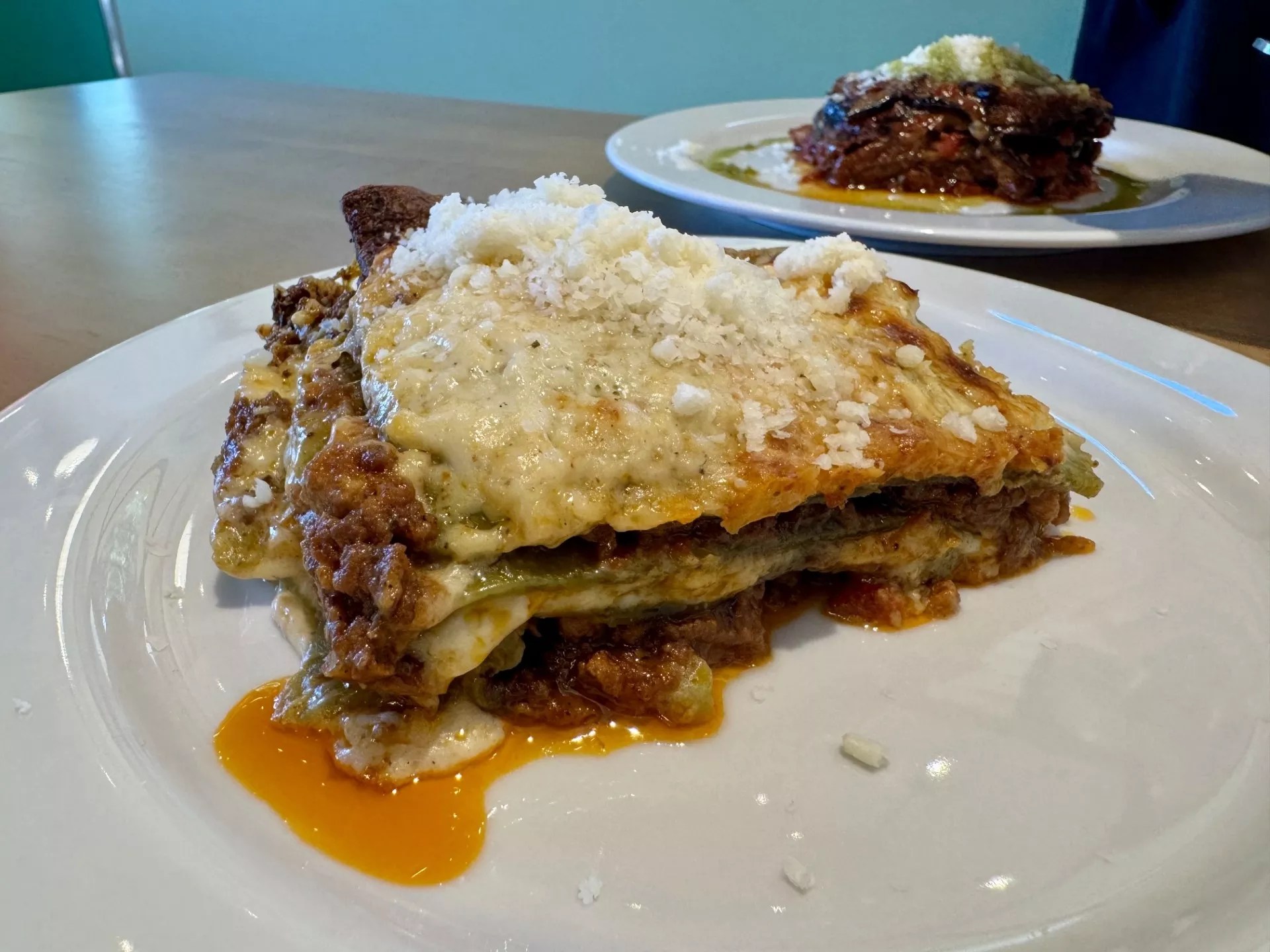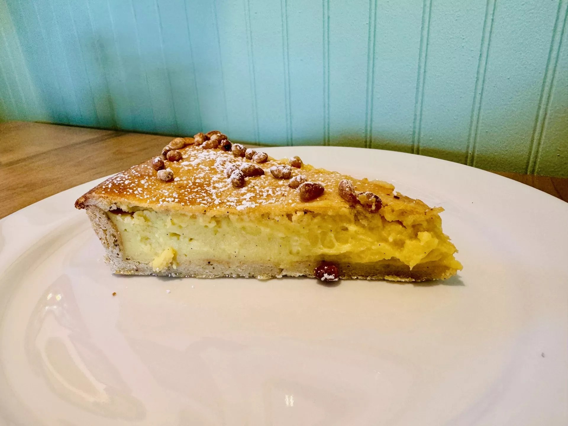 Our dining partner ordered the lasagna ($14.90) and gave it high marks. The lasagna at Due’ Cucina is made of egg-dough pasta, Bolognese sauce, Parmigiano Reggiano and bechamel. For dessert, we tried a slice of Torta Della Nonna ($6.70). That translates to “Grandmother’s cake,” a rich custardy pastry topped with pine nuts. It was good – not overly sweet, but just enough.
