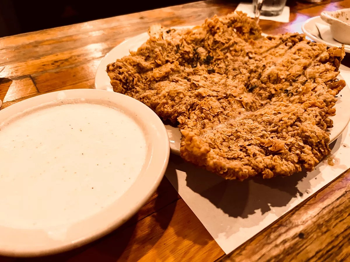 It’s served with a side dish of cream gravy that employs the drippings of ham roasted earlier in the day. After finishing his description, our bartender also warned us about the sheer quantity of food we were about to order. But our mouths were watering over “cream gravy with ham drippings,” so we plowed ahead undiscouraged.