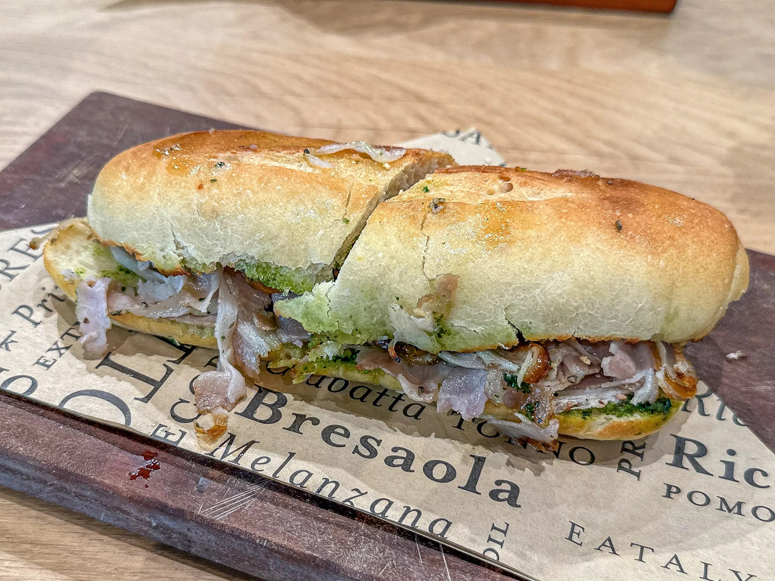 We’ve compiled a list of such offerings here in the Dallas area, but such lists should never be exhaustive or finite, and when we saw “porchetta panino” listed as an option at one of the counters offering freshly made food at Eataly at NorthPark Center, we ventured out to give it a try.