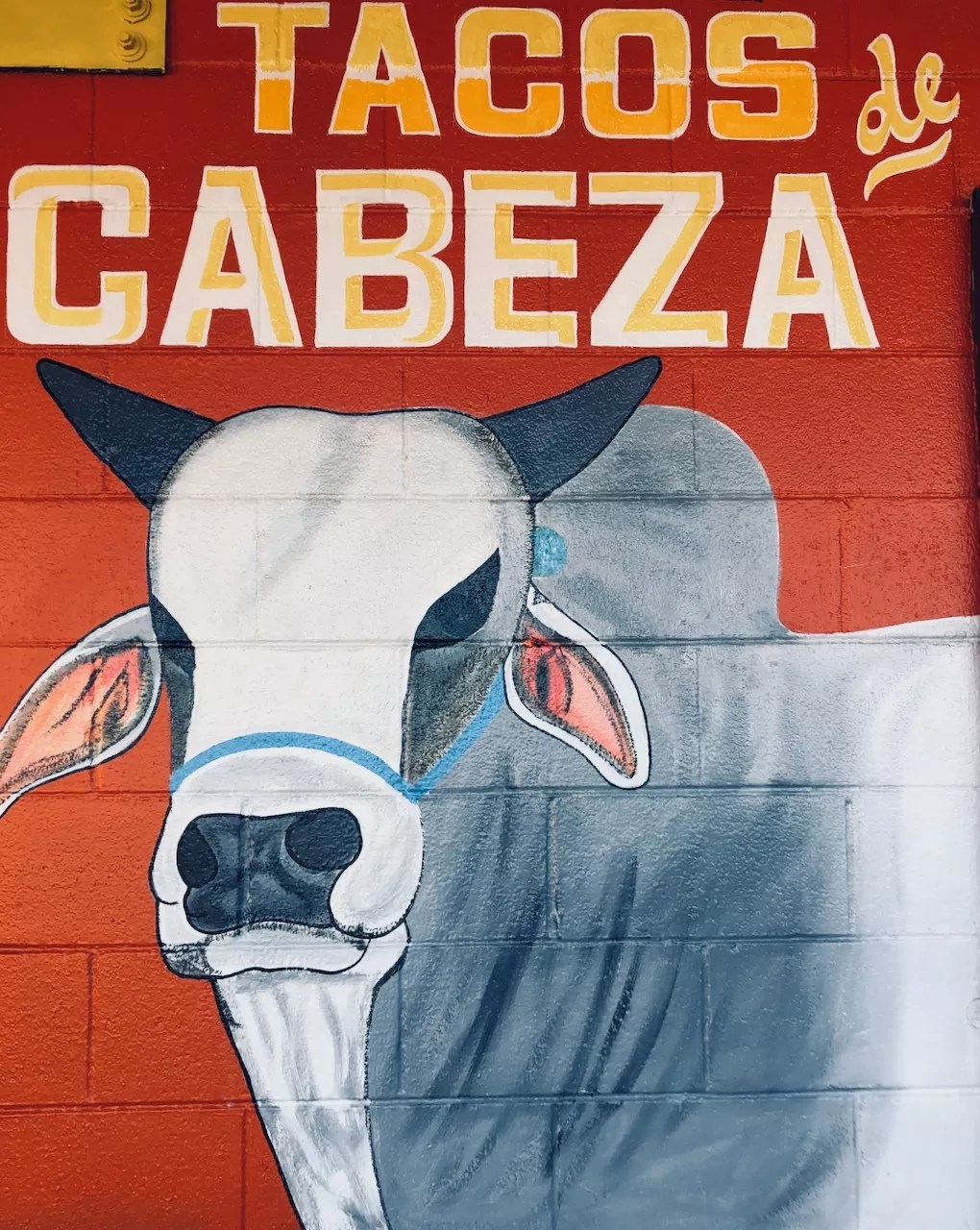 Other menu items include alambre (grilled beef with peppers, onions and cheese), tortas, huaraches (masa topped with beans), trompo, memelitas and tacos chapulines. There are also tacos de cabeza, served on freshly made tortillas. Orange signs taped to the window promote 20×20 tacos.