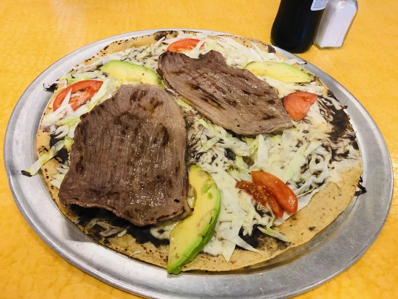Tlayudas is an Oaxacan street food that is easiest, although probably not best, to describe as the Mexican version of pizza. The base is a thinly-pressed, large, slightly crispy tortilla, covered with refried beans (black here), shredded iceberg lettuce, avocado, cheese and whatever meat you’d like, including chapulines.