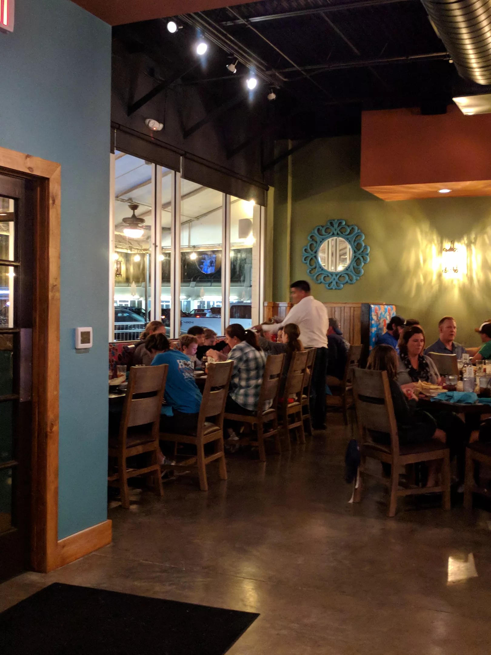 The interior at El Vecino features warm blues, greens and teals and a few brightly-colored booths.
