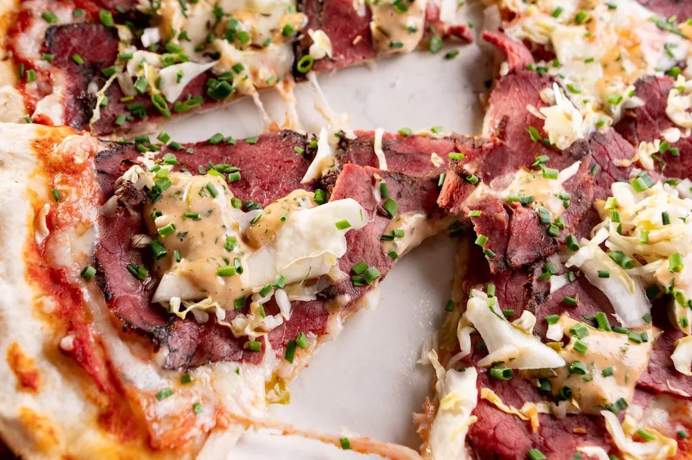 ZaLat Pizza has already proven that a Reuben sandwich can be converted into a pizza. But Encina’s got its own twist on the idea, using pastrami instead of corned beef along with sauerkraut and “pickle sauce,” which tastes like an extra-vinegary Thousand Island dressing ($16). It’s all on top of an ultra-thin crust that’s pulled out of the oven just a minute or so before it becomes a cracker.