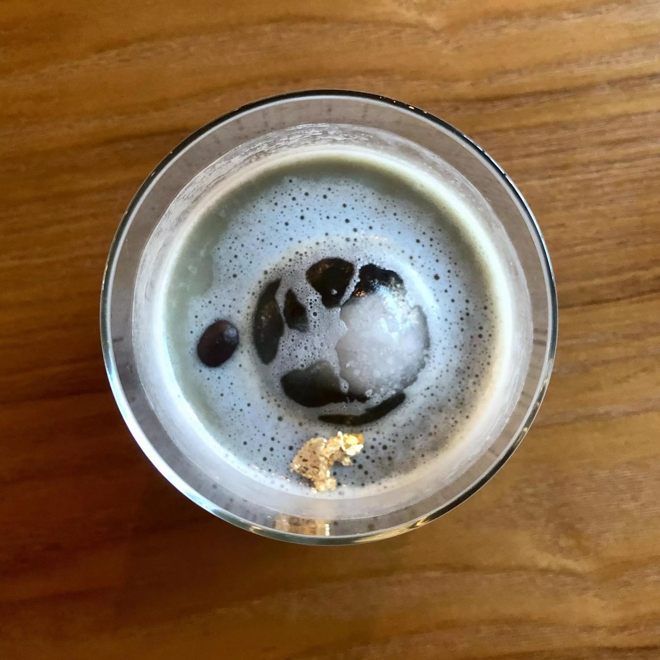 The Aurora Sky ($9) is layered with espresso, milk and what the café calls its “special tea” made from butterfly pea flowers. The ingredients create a gradient color effect, and because of the color lent by the butterfly pea flowers, the top layer of the drinks ends up being a pale, milky periwinkle. We thought it had a matcha-esque hint of grassiness (but a touch more subtle). It’s served cold with one large, round ice cube and a single pinch of gold leaf. We’d definitely order it again.