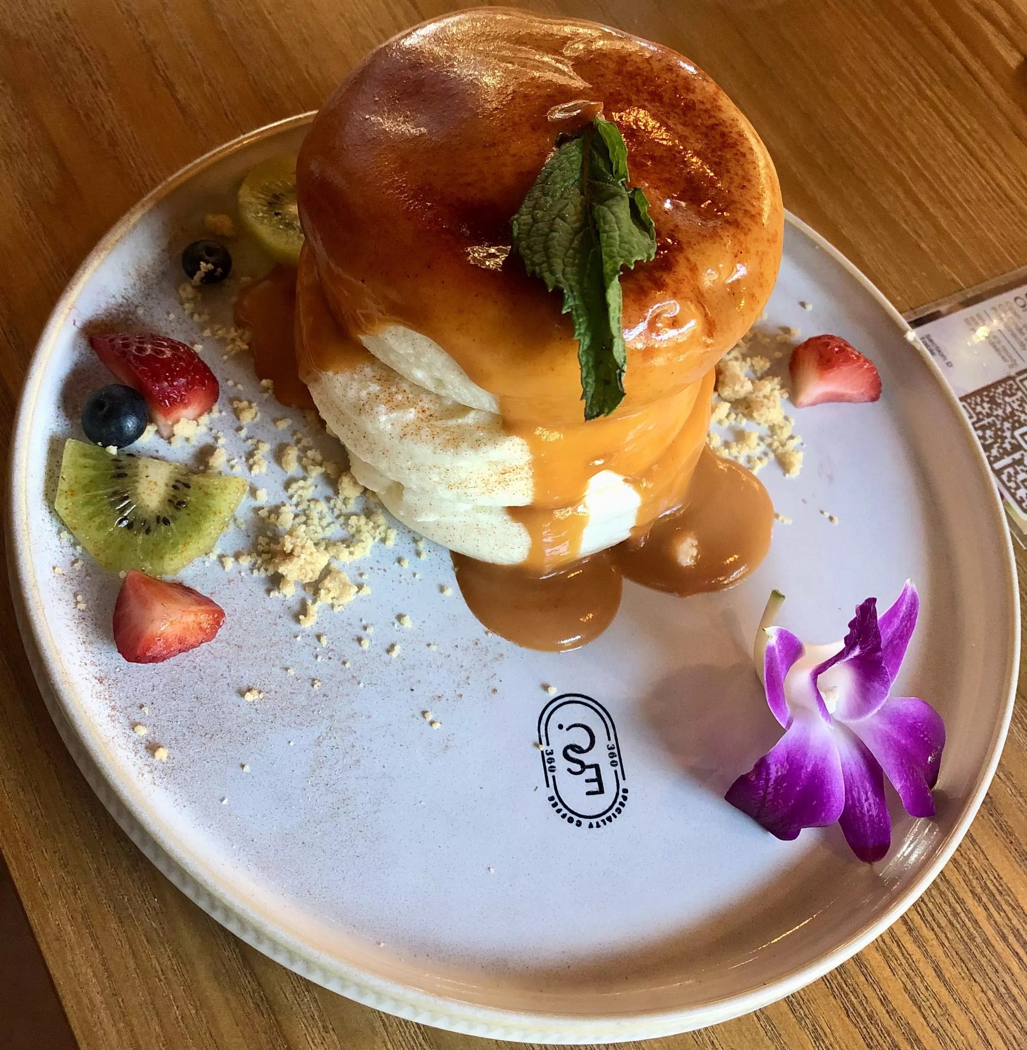 A plate of delightful Thai tea soufflé pancakes, served with a literal orchid – a detail we simply can’t get over.