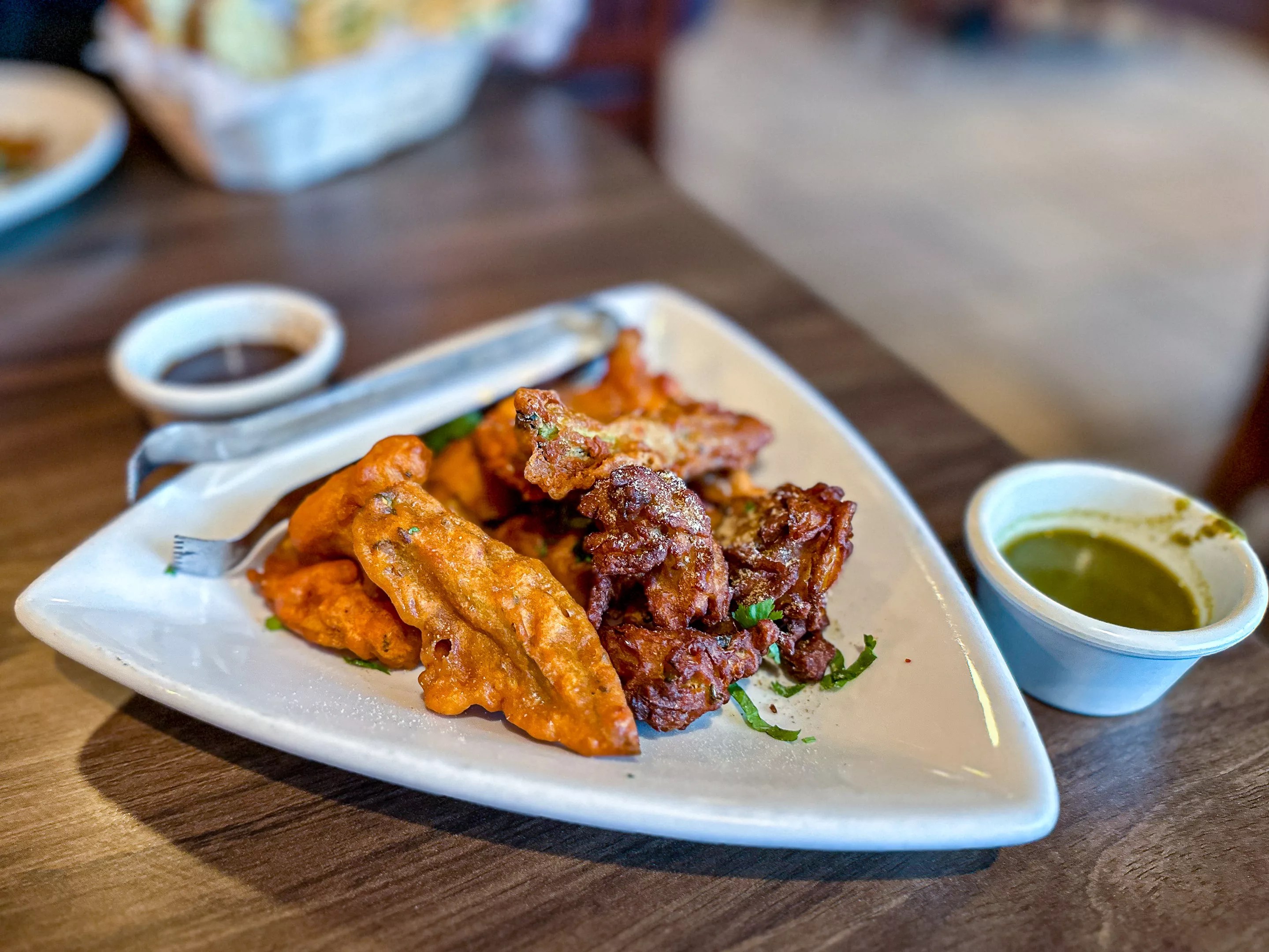 Mixed vegetable pakoras — gobi and jalapeño-stuffed with basin and deep fried, deconstructed.