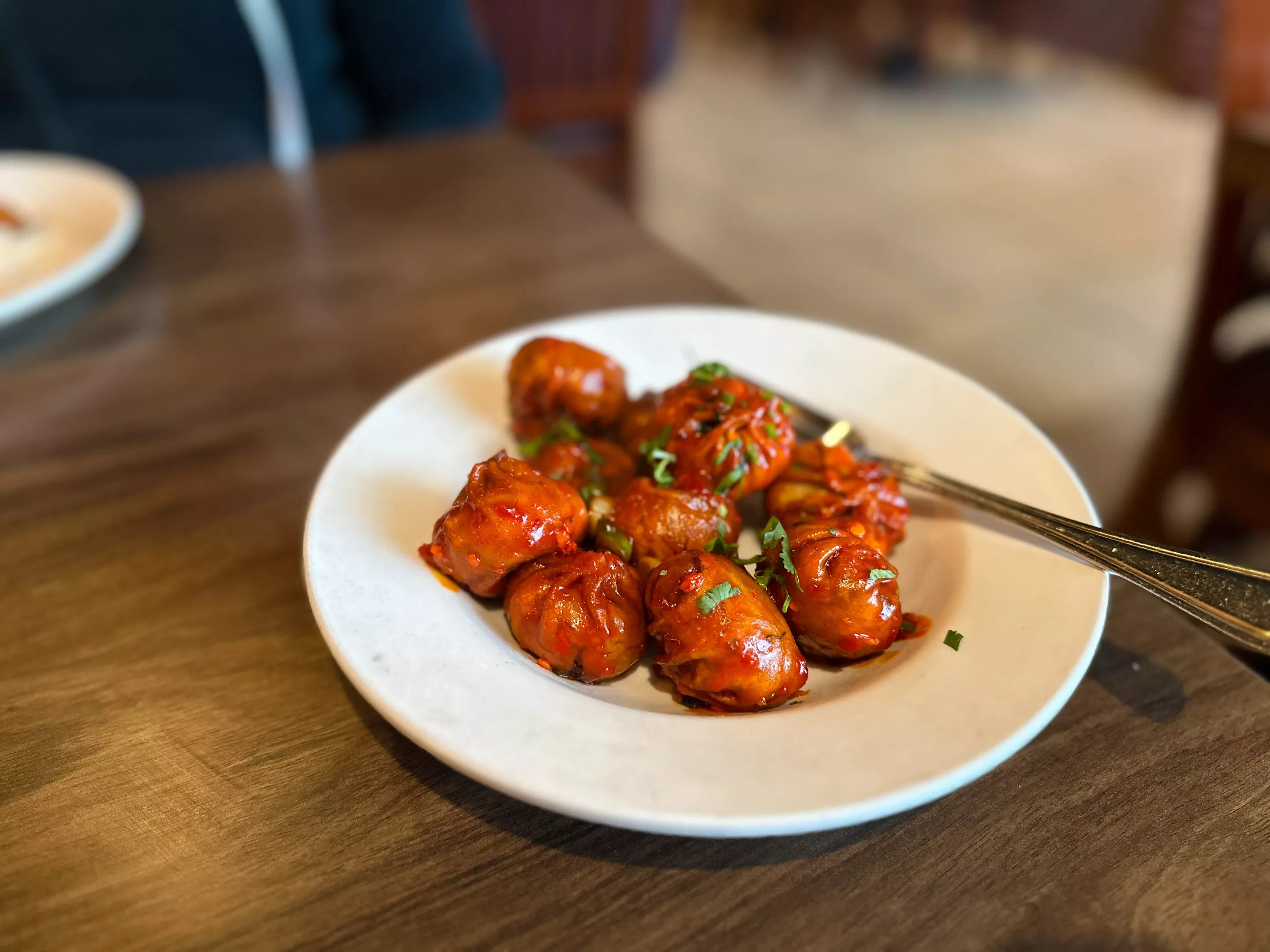 This was followed by some vegetable chili momo, the original reason for the visit. These were round rather than crescent-shaped, pan-fried and covered in spicy chili sauce and garnished with parsley and green onion. They were OK, but the sauce was a bit overpowering and the texture a bit off-putting; we were left wishing we’d ordered the chicken momo instead.