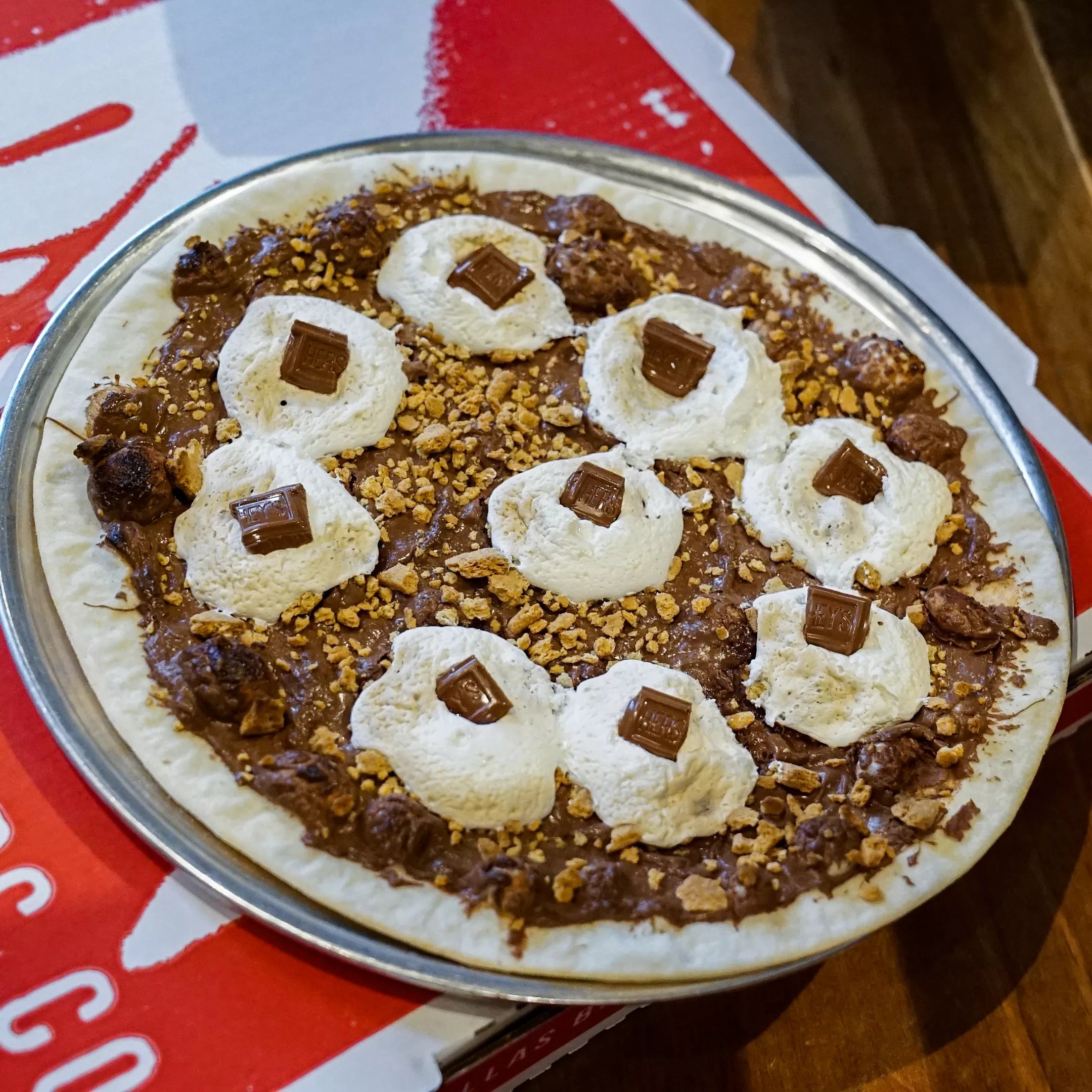 Sounds better than it looks: The s’mores pizza from GAPCo is topped with Nutella, marshmallow fluff, graham cracker crumbles and Hershey bars.