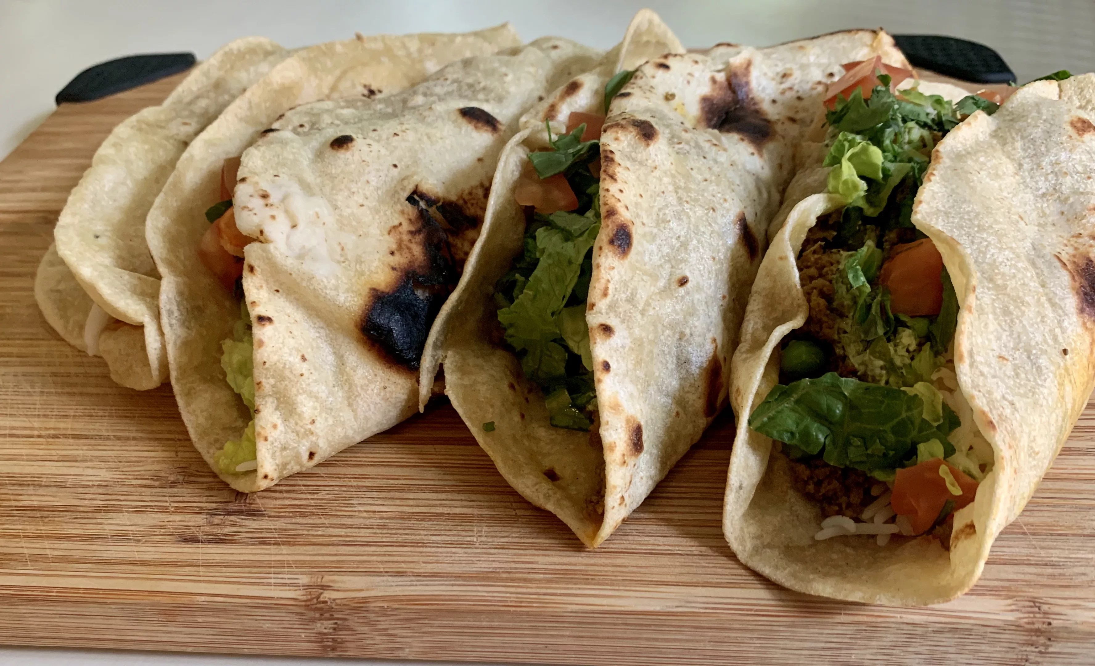 Tacos in roti, blistered flatbread, on the right are Keema Minced Beef with romaine lettuce, tomatoes and a creamy sauce. Shrimp tacos on the left in a spicier, coconut-based sauce.