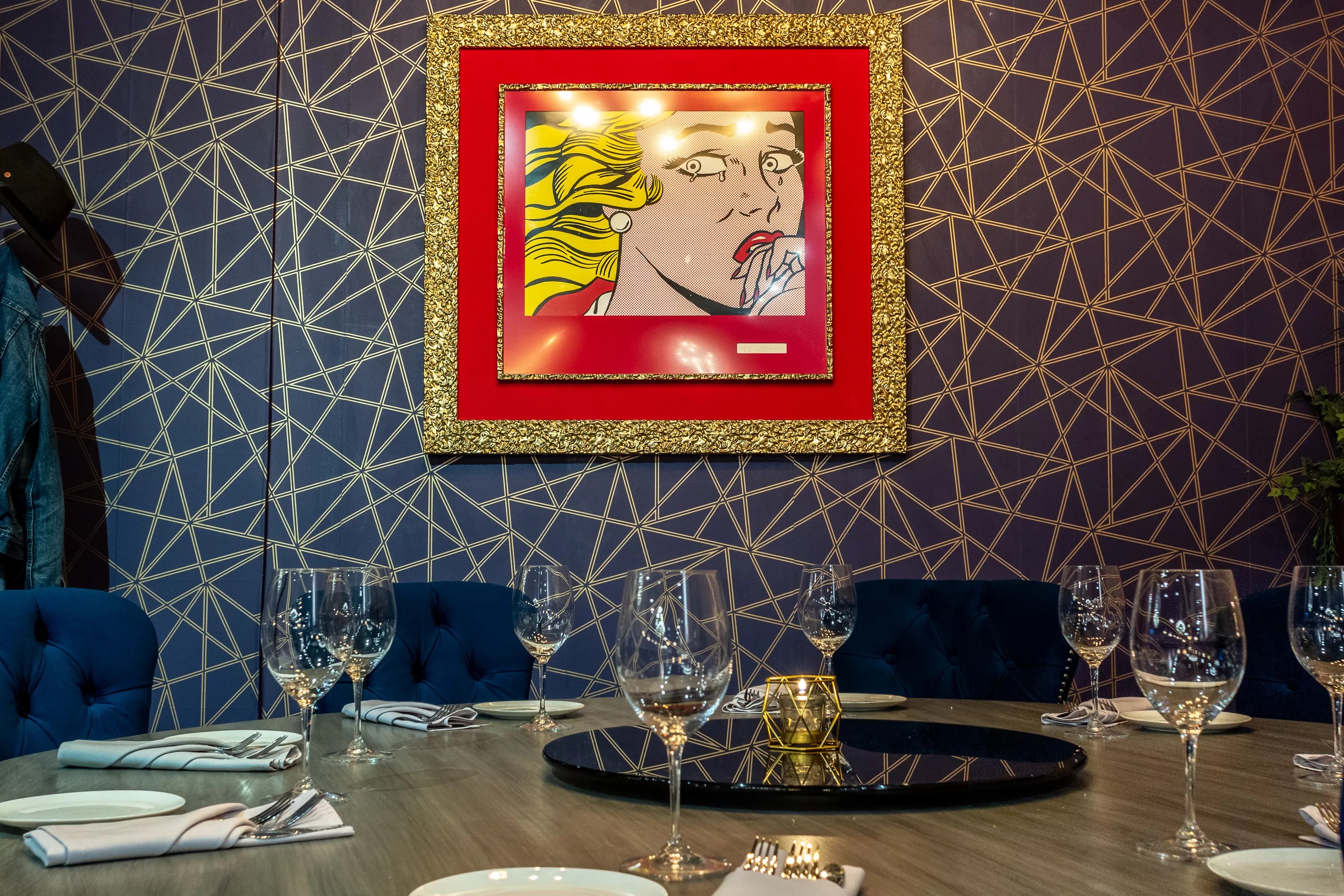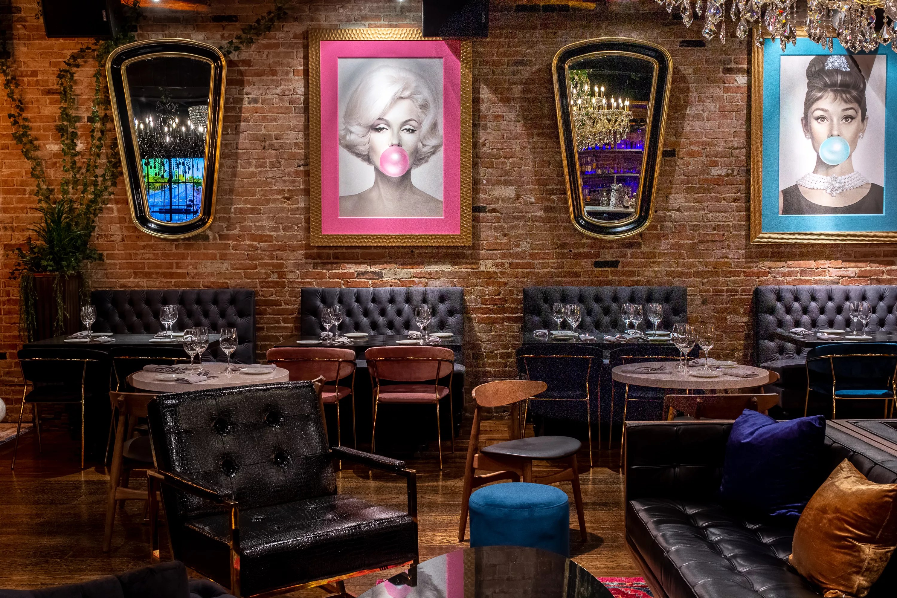 What does this dynamic team have on tap for their loyal patrons? A visual feast. Open the doors and take a step back in time. The mid-century modern space offers a whimsical mix of plush décor – velvet chairs, ivy festooning the walls, crystal chandeliers and pop art pieces from some of the shakers from the ’60s including Roy Lichtenstein and Jeff Koons. Enjoy an opulent evening, dining next to your new best friends Marilyn Monroe, Audrey Hepburn or Popeye the Sailor Man. Oh, if those walls could talk…