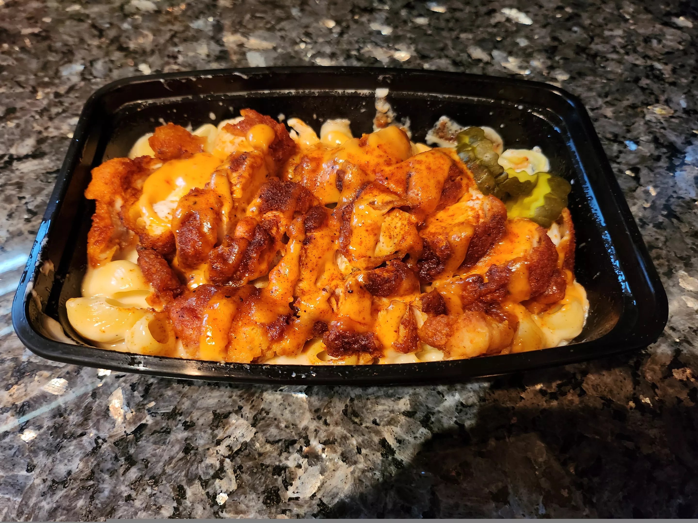 The mac and cheese, topped with chopped hot chicken tenders, didn’t disappoint.