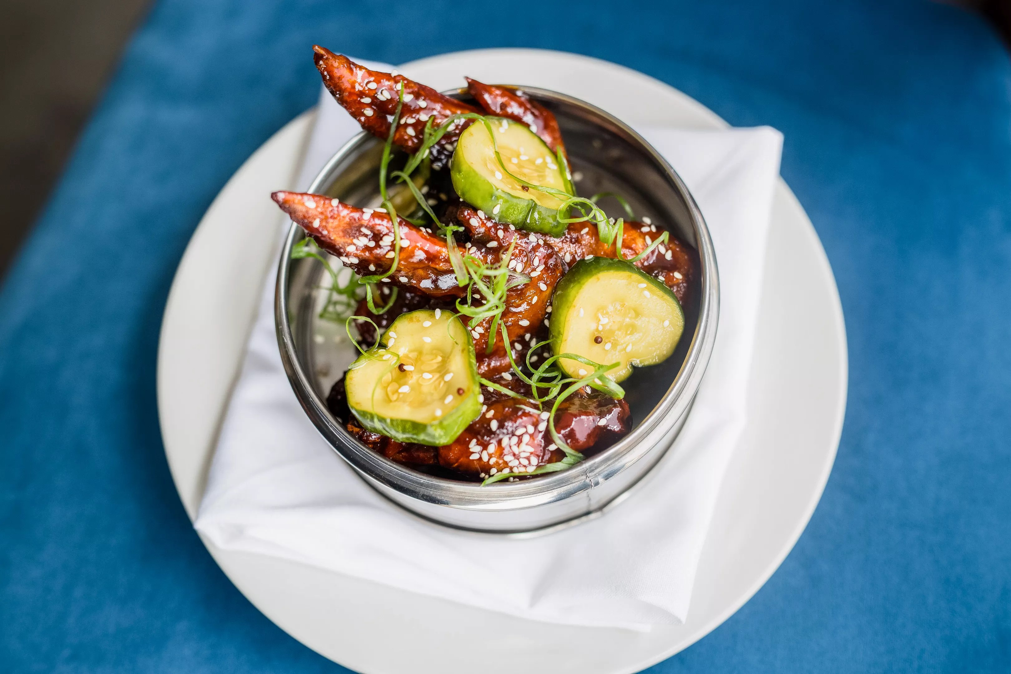 Fine China’s spicy chicken wings, “in which the wings are air dried for a crisper texture, tossed with house made Sama Sama sauce and served with bread and butter pickles.”