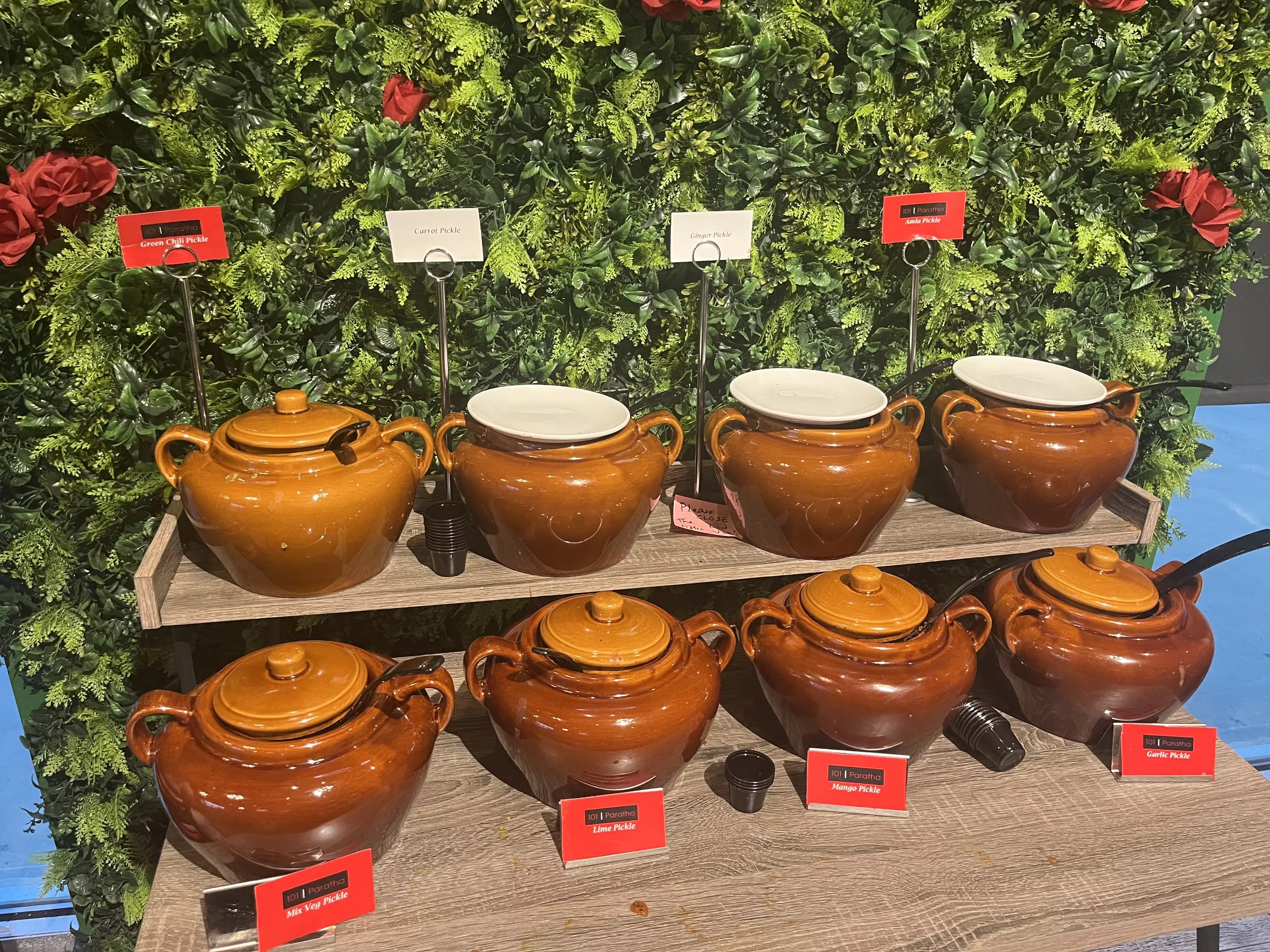 A self-serve achar bar offers eight types of spiced Indian pickles.