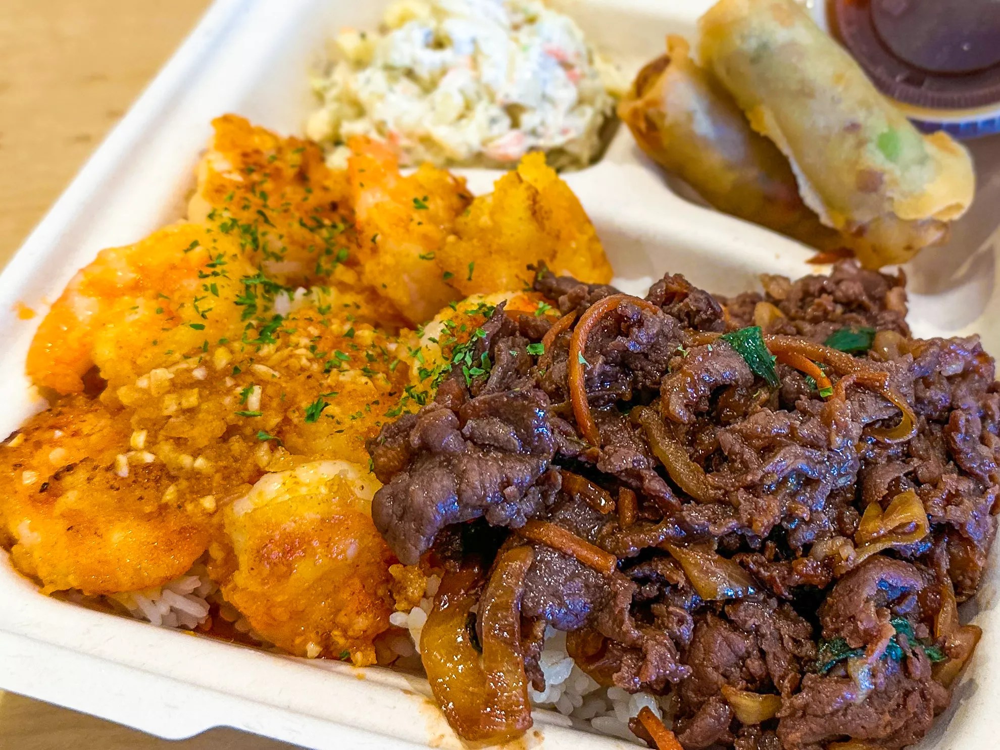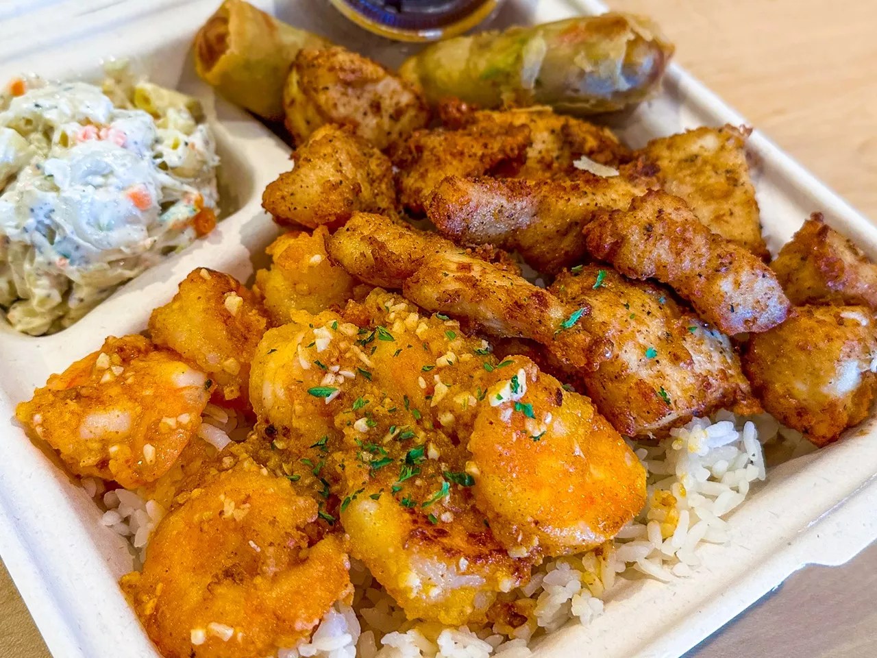 The uncomplicated menu offers shrimp, chicken and bulgogi beef served separately or in a variety of combos that include a scoop of macaroni salad and an egg roll on a bed of steamed rice. The protein can be ordered either spicy or mild, and the shrimp can be cooked in either a butter garlic sauce or coconut, all priced around $14 for a good amount of food.