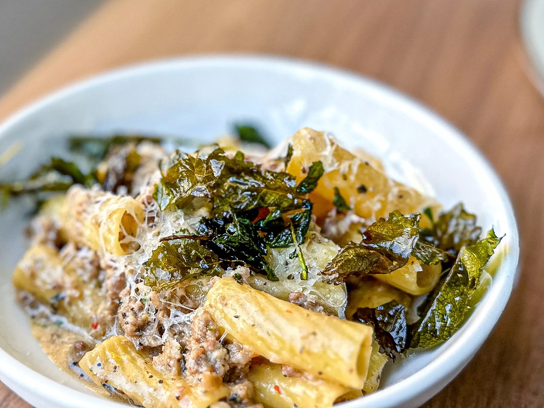 A half order Italian sausage rigatoni: bourbon cream, kale, sage and grated parmesan cheese.