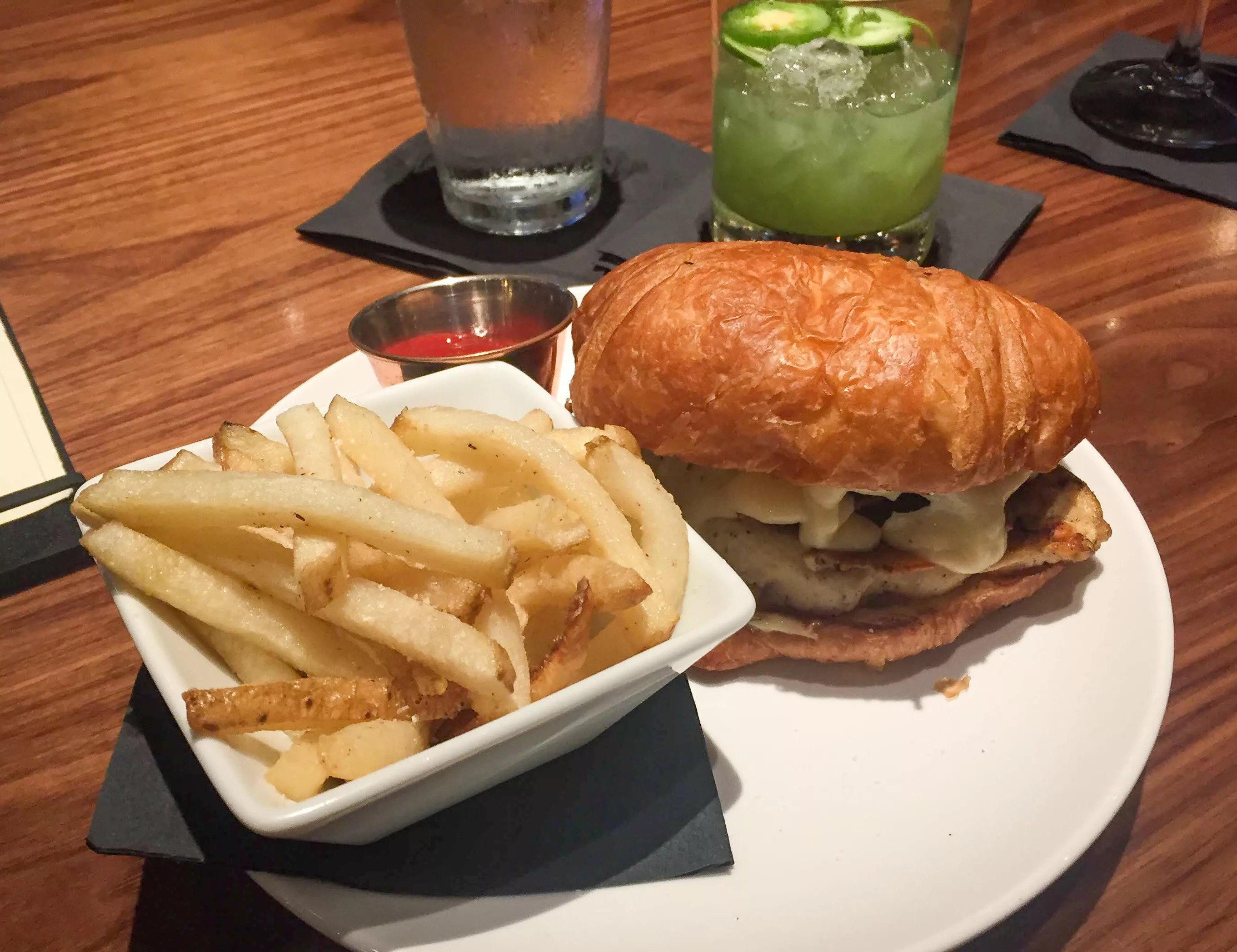 The chicken, salami and Swiss sandwich has grilled chicken breast, crispy fried salami pieces and gobs of melted Swiss squeezed between a croissant bun ($11.99). In the absence of vegetables, the crispy salami gave the sandwich a nice crunch, but overall it wasn’t a memorable meal.