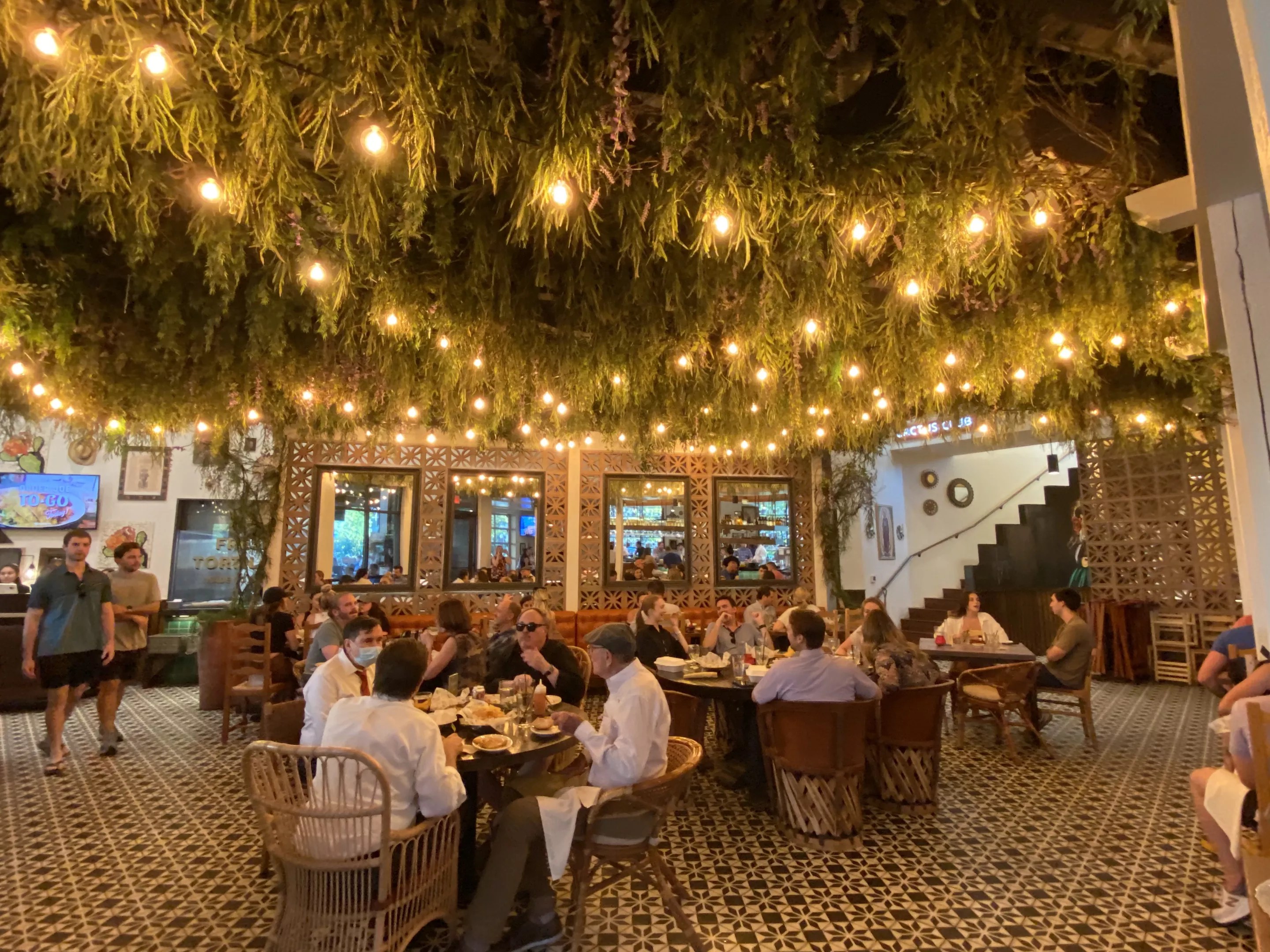 The walls are adorned with mirrors, photos, paintings and trinkets. The restaurant displays various styles and colors of tile throughout. The chairs vary from table-to-table with wicker, wooden and plush leather upholstery at the bar. The party doesn’t stop there, the dining room is relatively small, but the patio is huge.