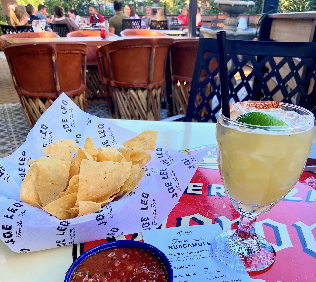 Round one at Joe Leo is warm chips, salsa and a spicy mango margarita.