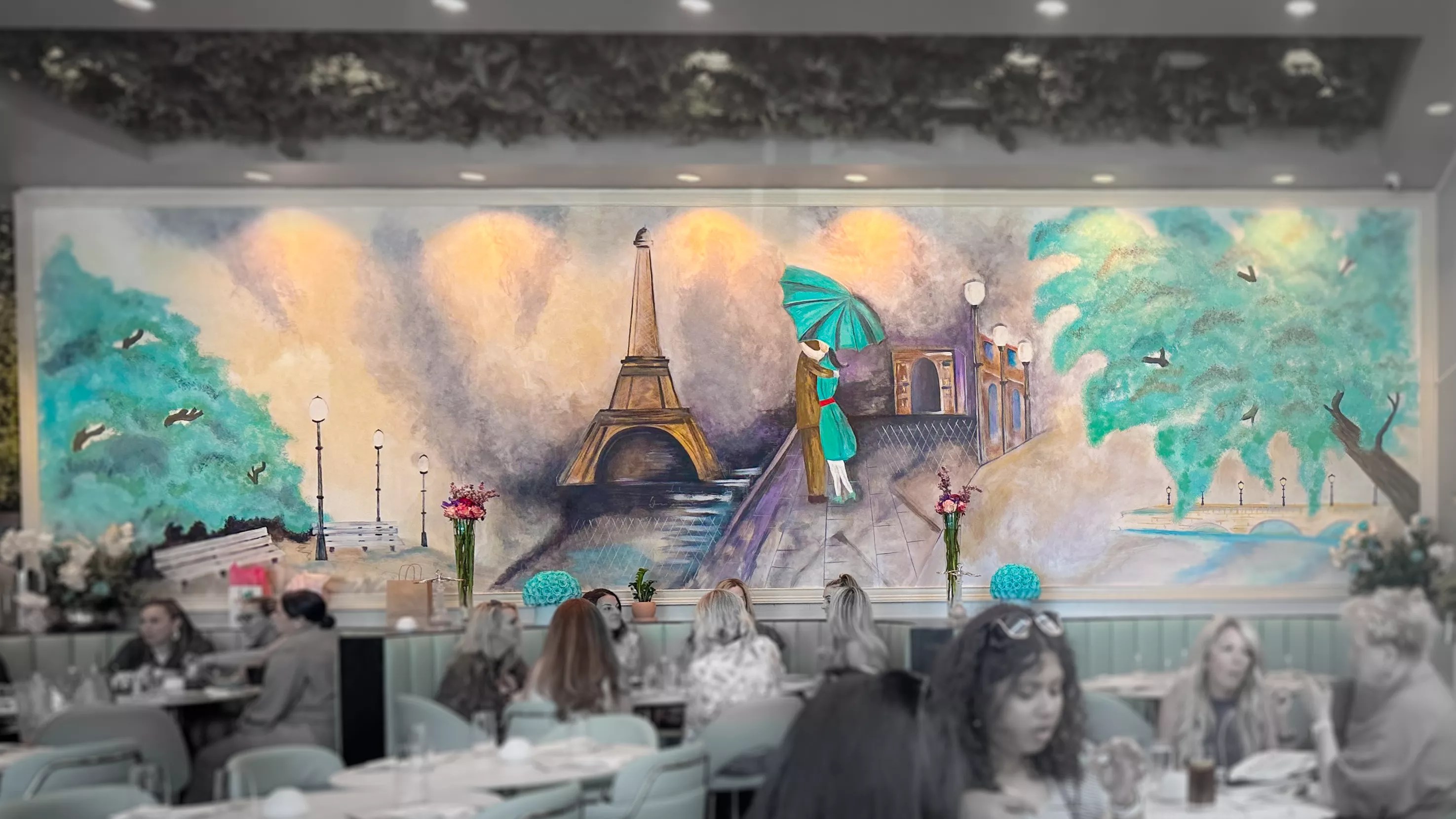 The large mural in the dining area caries over the color scheme and does a great job of putting one in a Paris mood.