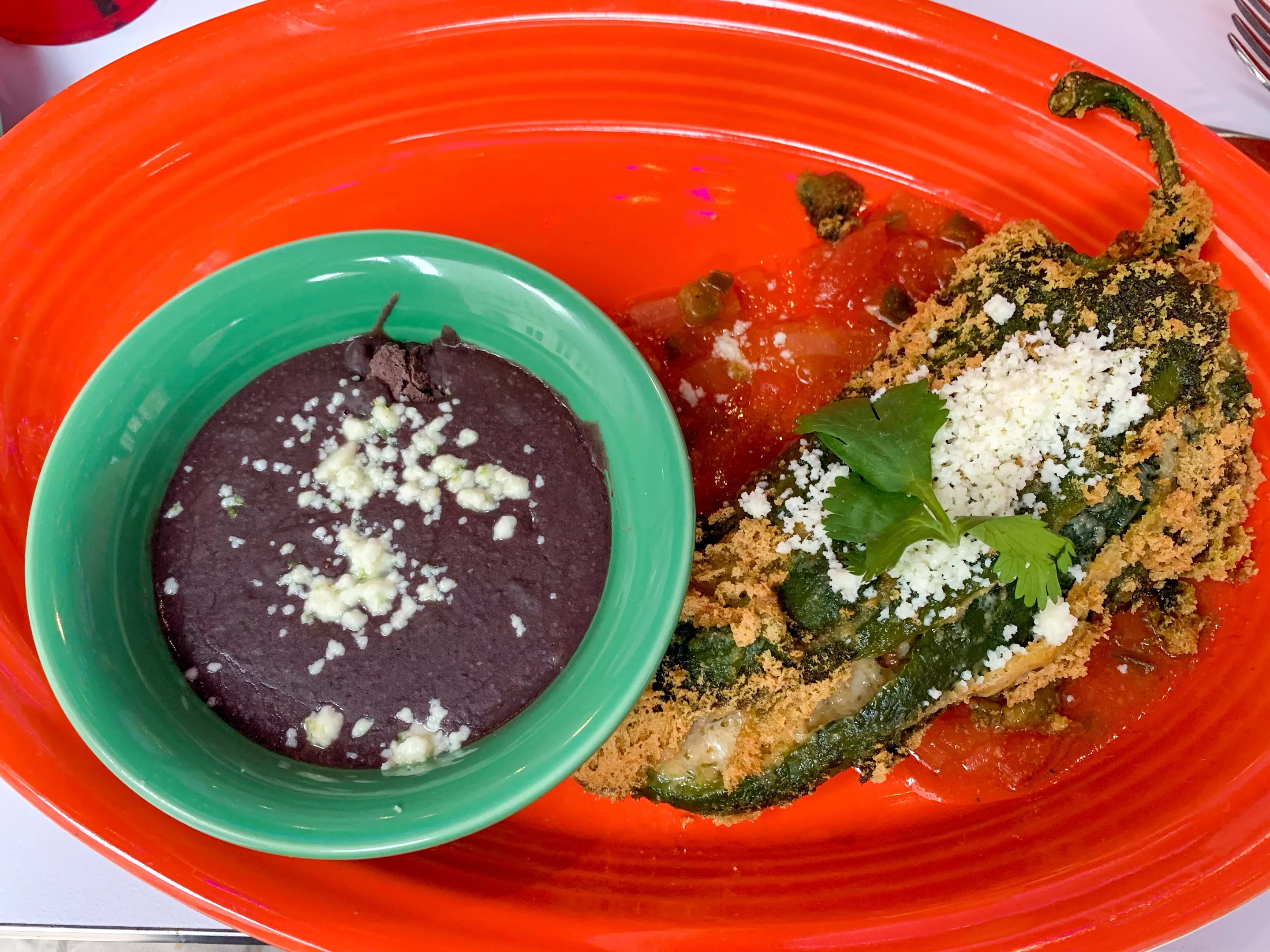 The chile relleno is huge, enough to share or enough to take some home – which you won’t mind because it’s a pretty good experience. It leans just a bit sweet, complemented by plenty of cheese, just a hint of spice and mushrooms. I’d suggest mentioning that last ingredient on the menu, as it’s not expected, and some folks hate those with a passion. I’m not one and loved it; they offer another heartiness to the commonly simple cheesy dish. The refried black beans on this plate were flavorful, offering a surprise of smokiness in flavor.