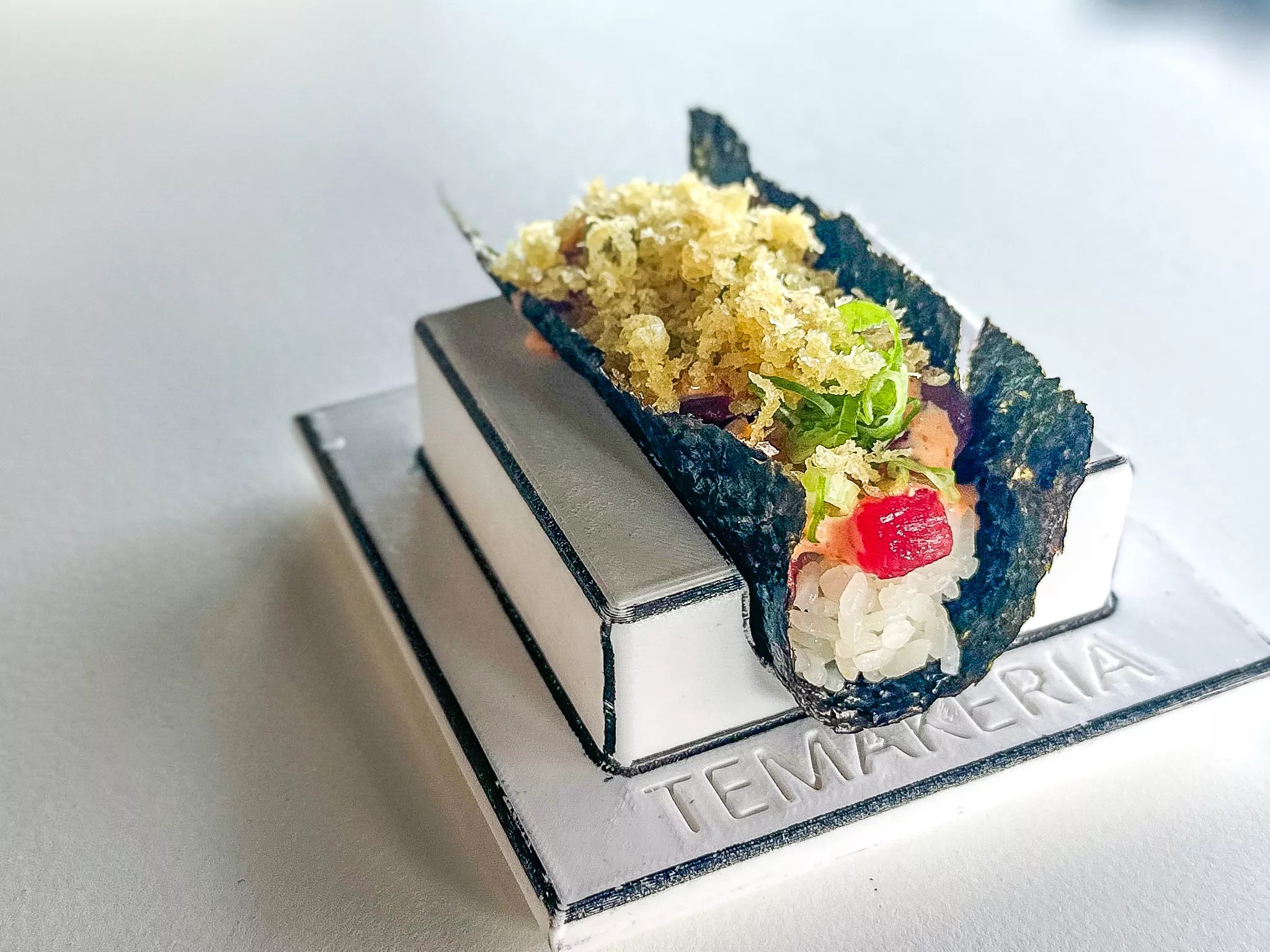 Spicy Tuna temaki: tempura flakes, spicy aioli served in 3D-printed taco holder