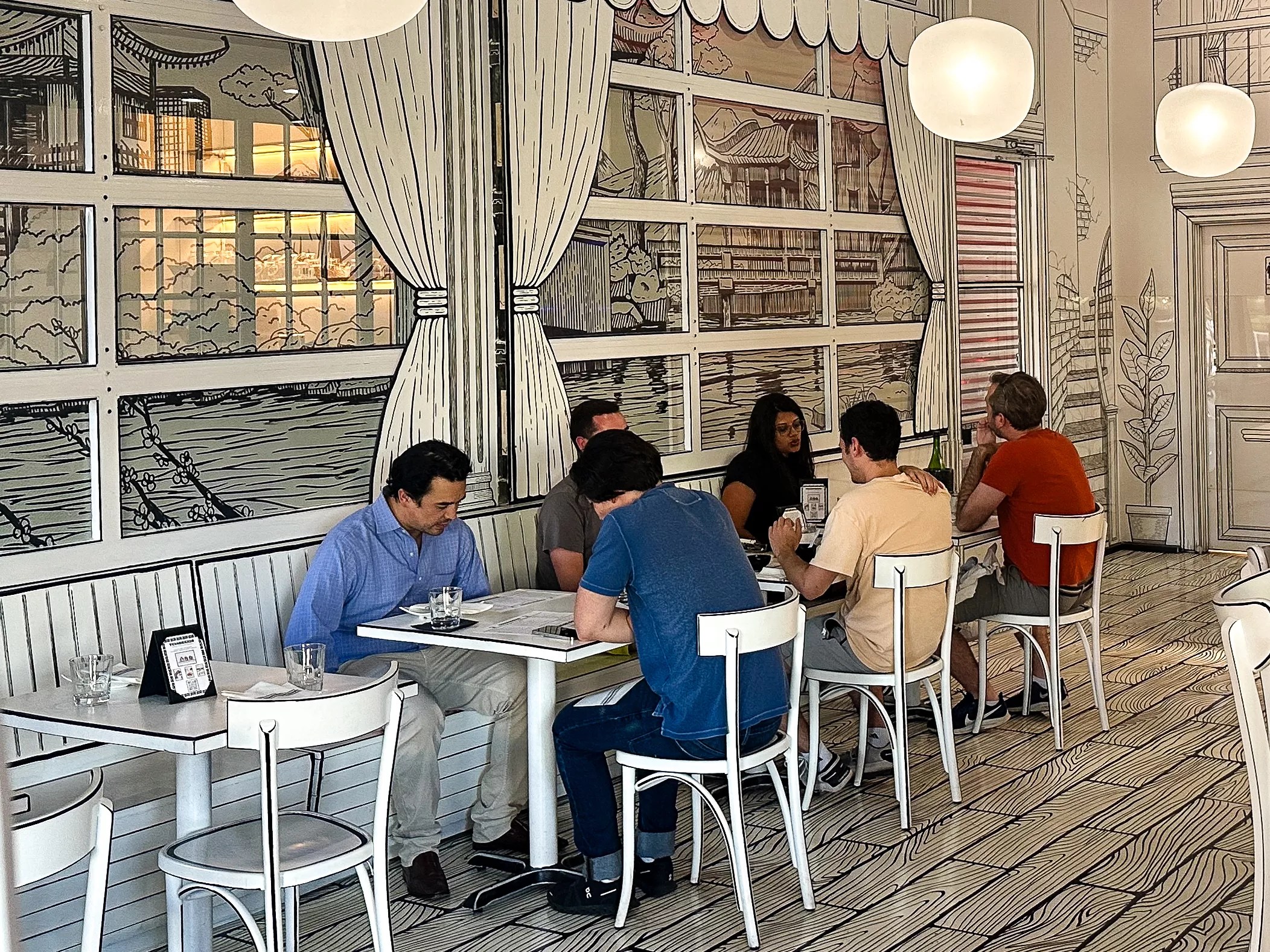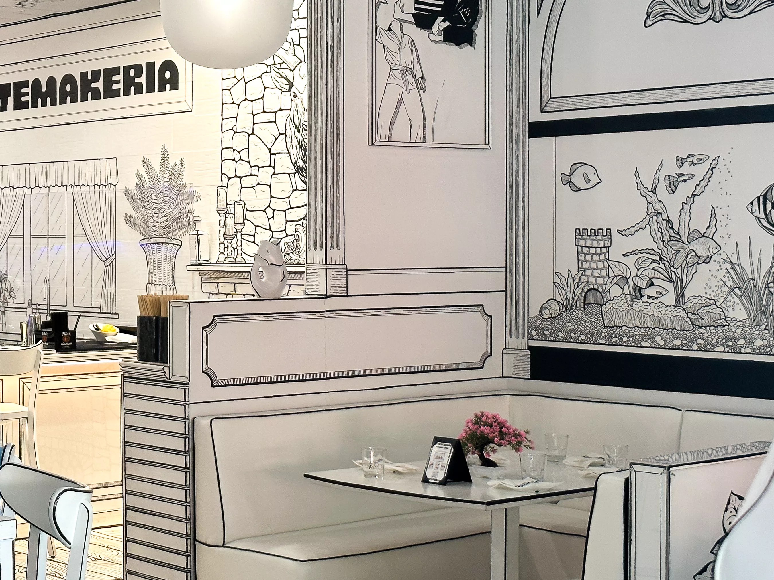 At Temakeria in Trinity Groves, local artist Jonathan Krown has created a 2D monochromatic space with paint and markers that evokes an unfinished coloring book.