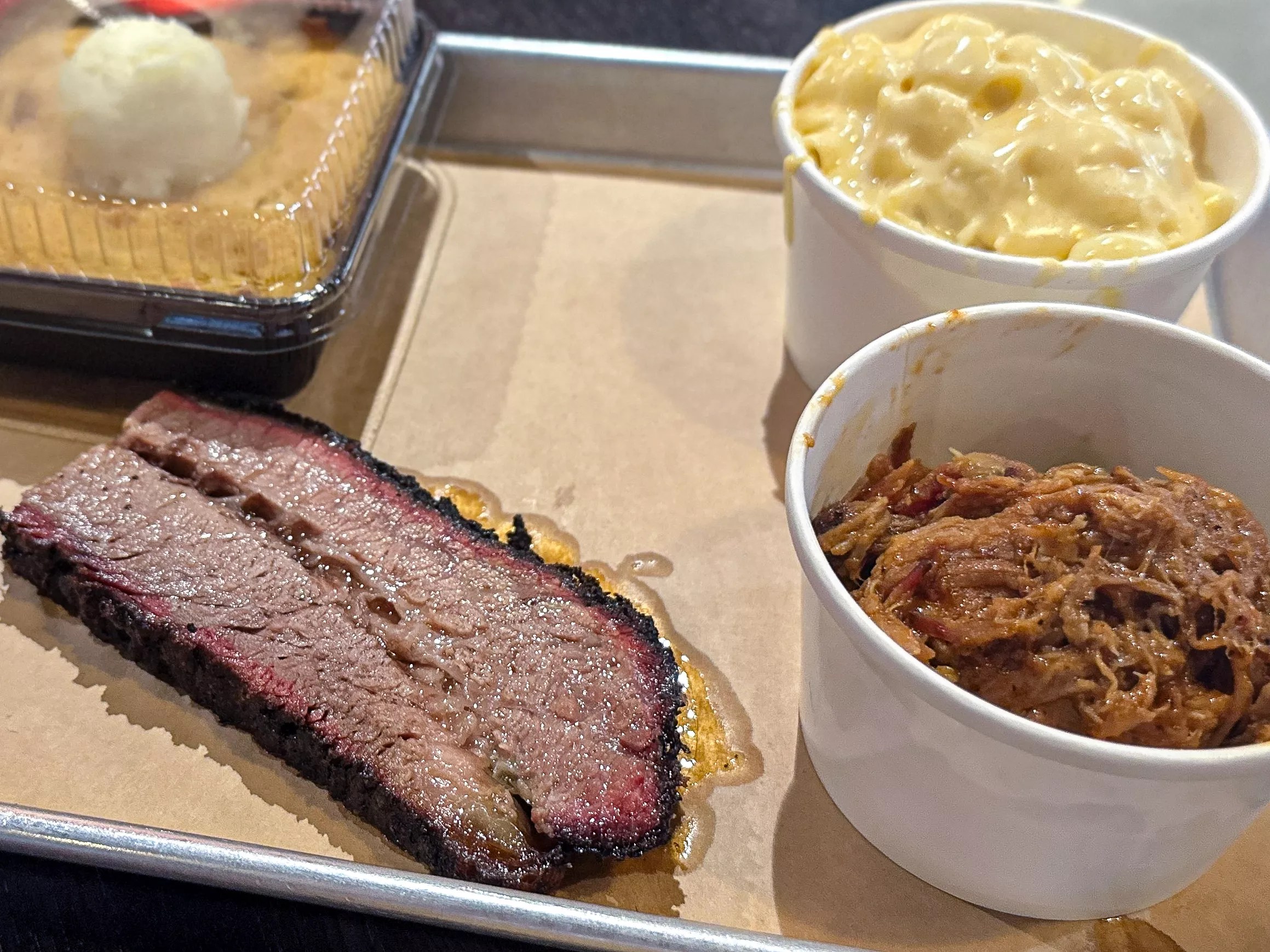 We ordered two separate two-meat combo plates, one with fatty brisket and pulled pork, the other with lean brisket and sausage. For sides, we went with serrano cornbread, mac and cheese, potato salad and fries. They don’t slice it up right there in front of you, so the wait was a bit longer, but it was worth it.
