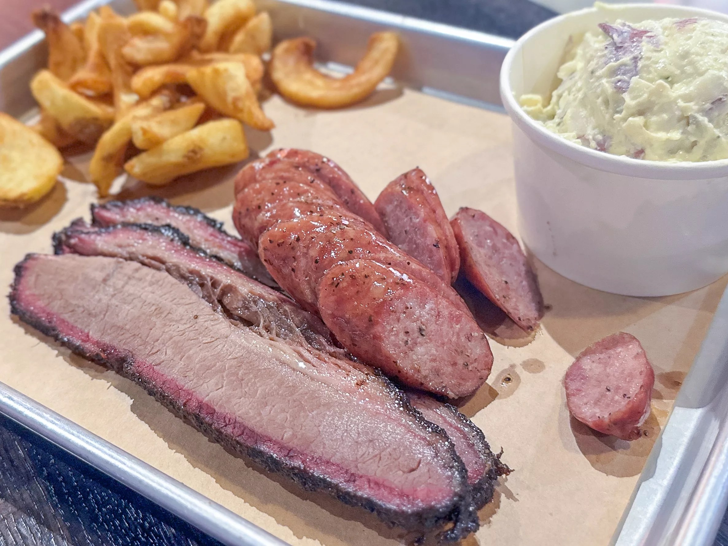 Two-meat combo plate with lean brisket, sausage, potato salad and fries.