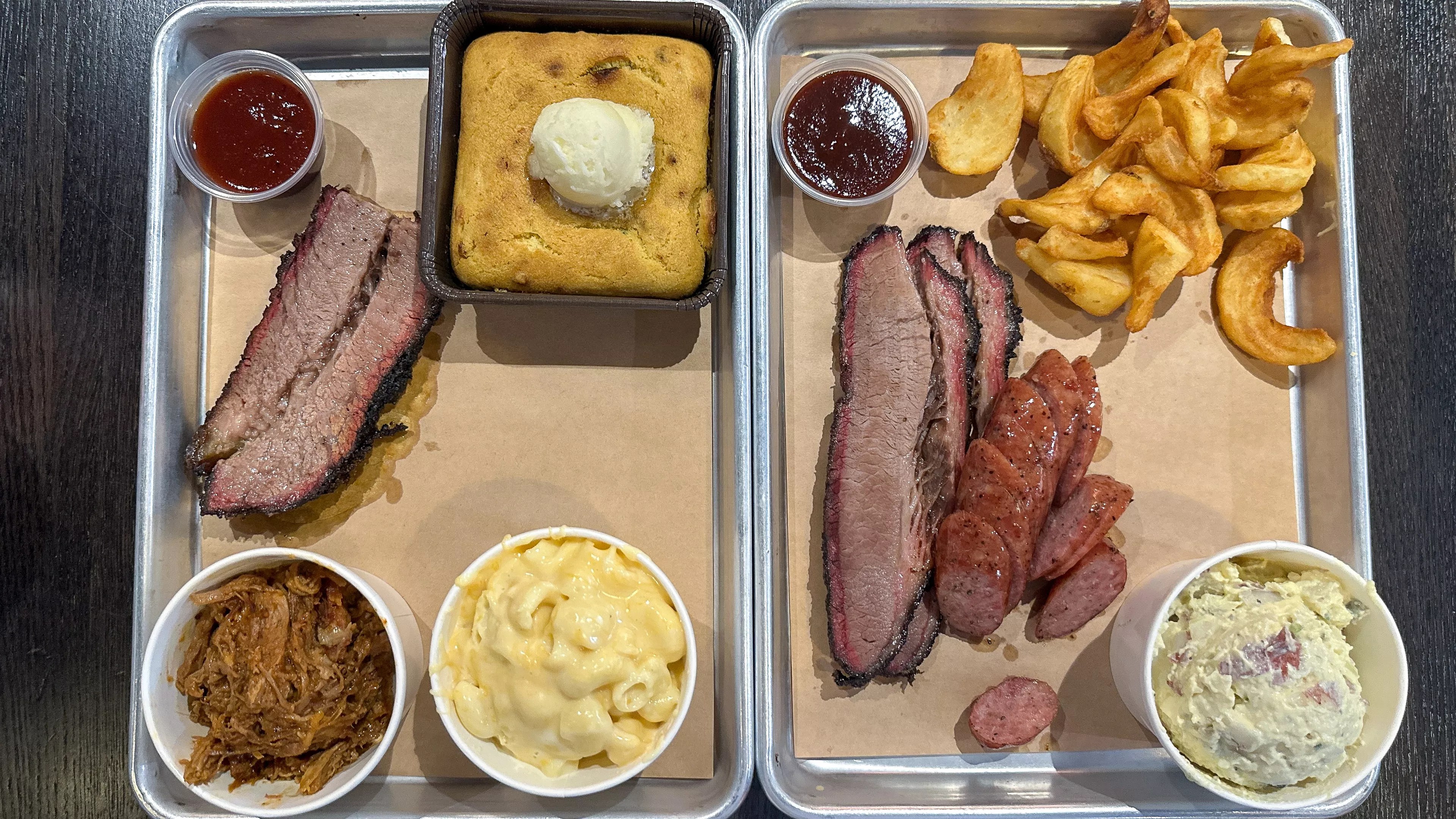 We ordered two separate two-meat combo plates, one with fatty brisket and pulled pork, the other with lean brisket and sausage. For sides, we went with serrano cornbread, mac and cheese, potato salad and fries. They don’t slice it up right there in front of you, so the wait was a bit longer, but it was worth it.