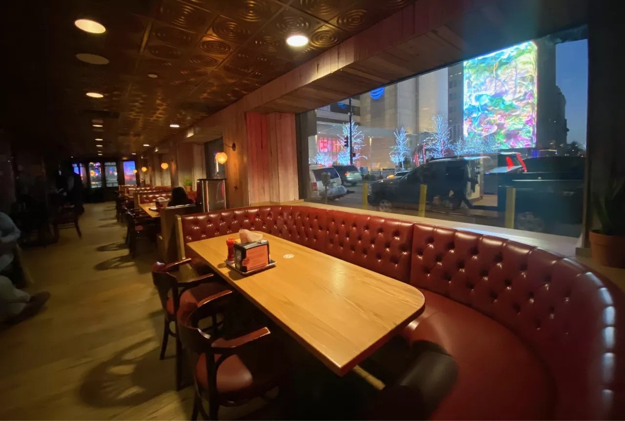 As mentioned, the Rodeo Bar bellies right up to the AT&T Discovery District at the corner of Commerce Street and Akard Street. Patrons inside can catch glimpses of the busy and bright space across the street through passing cars.