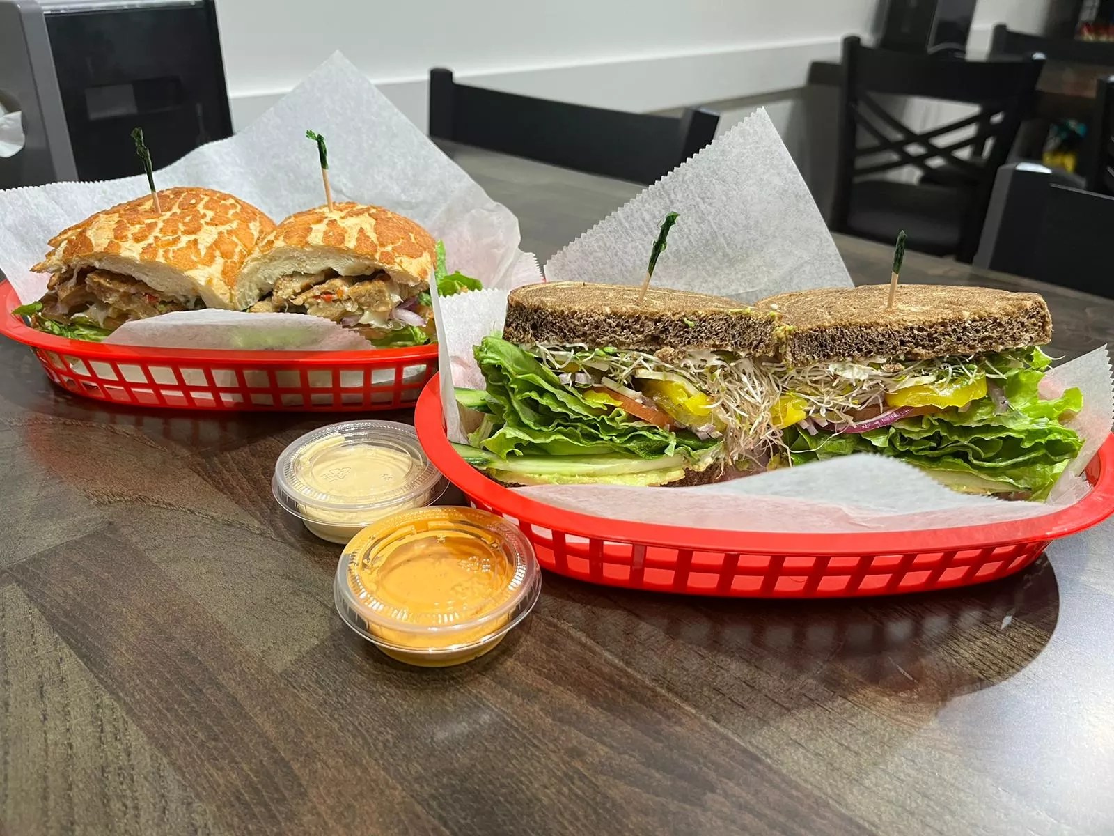 The menu in Texas differs from the ones you’ll find at the original California locations. While sandwich ingredients remain the same, the Frisco spot has made it a point to source its sandwich names locally. The “LoneStar sandwich” ($12.49) comes with hot pastrami, roast beef, salami and a choice of cheese. A sandwich called the “Baylor Scott Medical” ($11.99) comes loaded with marinated chicken breast, blue cheese dressing and pepper jack cheese. It’s all doused with hot sauce for a spicy kick at the end.