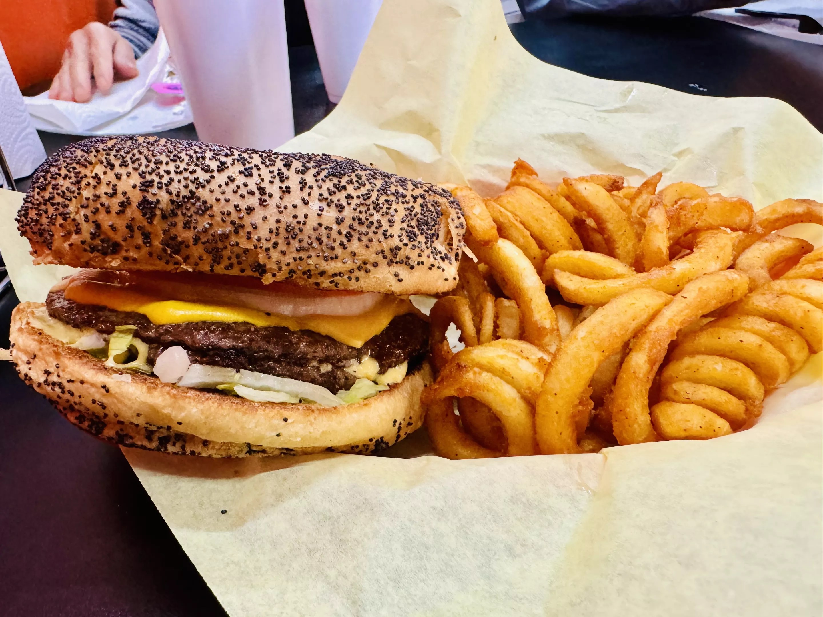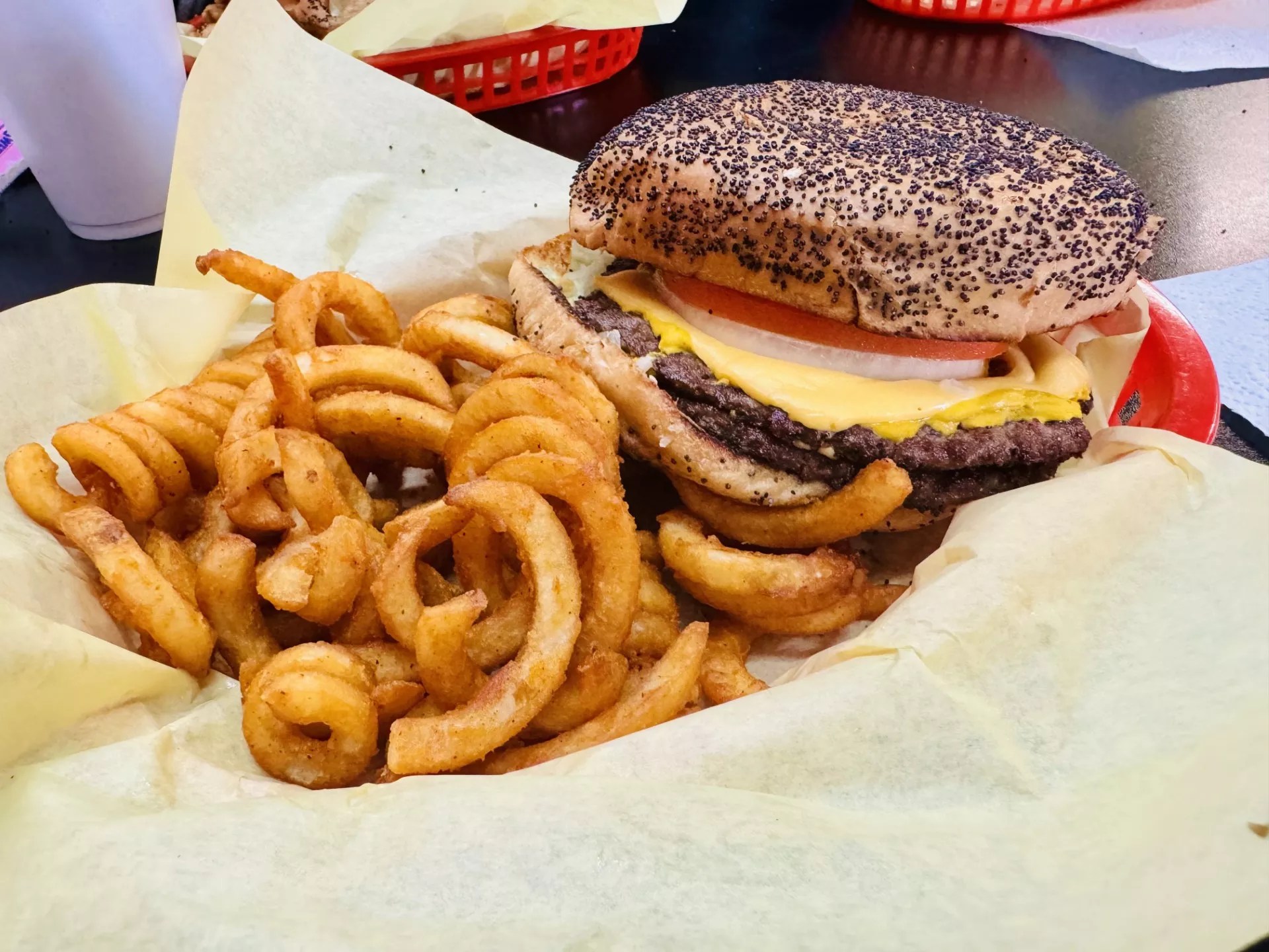 But the burgers, which come on toasted poppy-seed buns, are the main attraction. We started with a double-meat cheeseburger ($13.29 for the combo, including fries and a drink) and seasoned curly fries. This cooked-to-order beauty comes with two rather thin patties (not a complaint at all, just an observation) along with the requisite American cheese and toppings. Everything is ultra-fresh, and the curly fries were mere seconds removed from the fryer – piping hot and perfectly crisp.