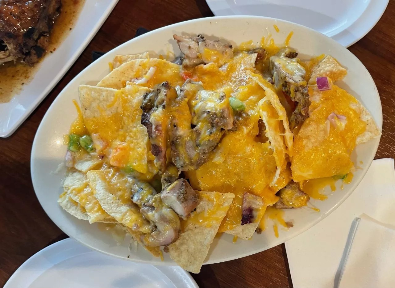When we visited on a recent Saturday, college football was in full swing on overhead TVs, and being suckers for a fine plate of nachos, we couldn’t avoid the jerk nachos ($11.92). Monterrey jack and cheddar cheese are melted over fresh tortilla chips, which is topped with tomato, bell peppers, red onions and chunks of spicy jerk chicken. A common appetizer again elevated to new heights courtesy of the Caribbean-seasoned birds at Jamaica Gates.